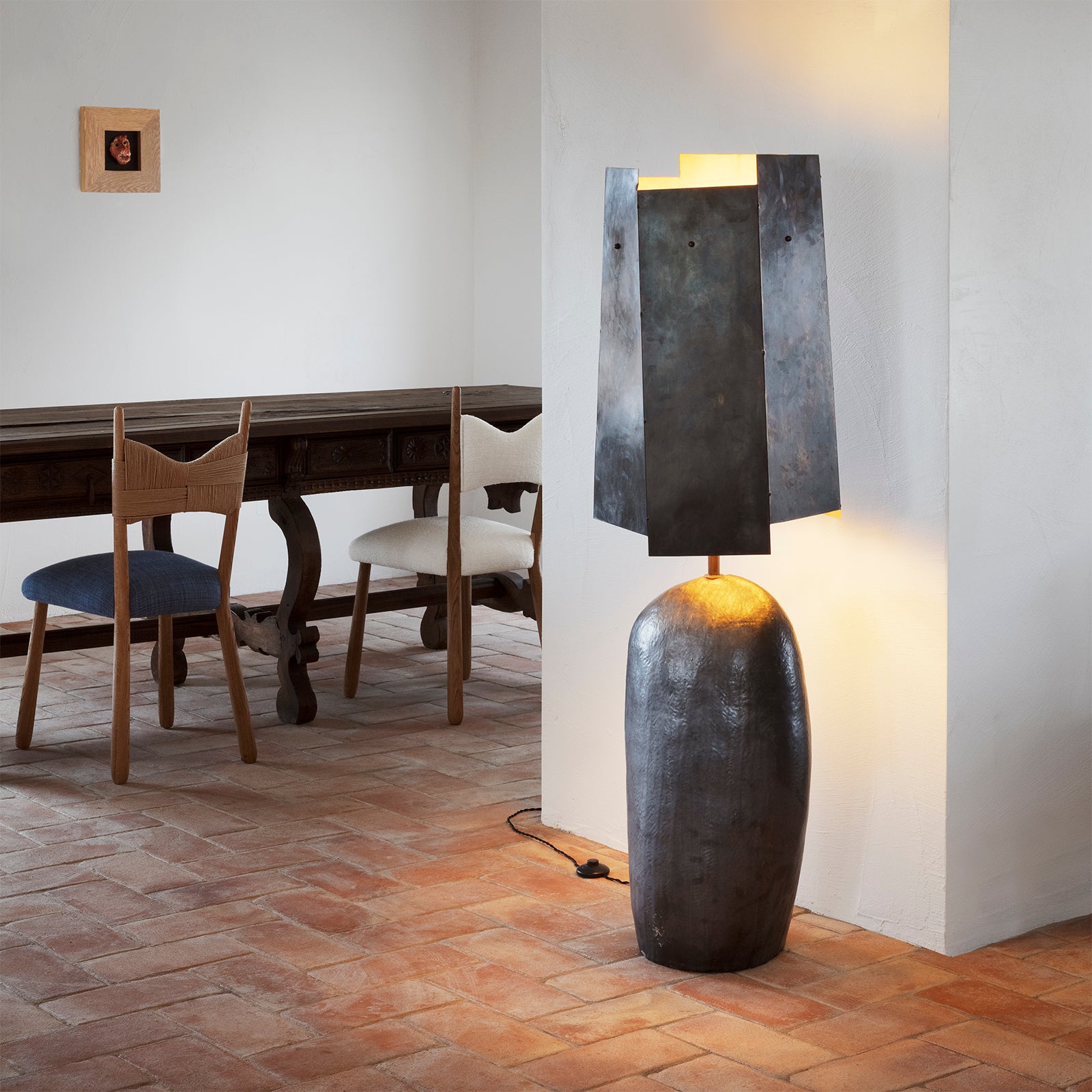 Large artisanal foor light made in Project 213A's own workshop. This piece has a hand-crafted ceramic base with a custom glaze finish. The lampshade stem is made from solid wood and finsihed in a hand gouged texture. Each piece is unique due to its handmade nature, shapes and shades vary slightly.
