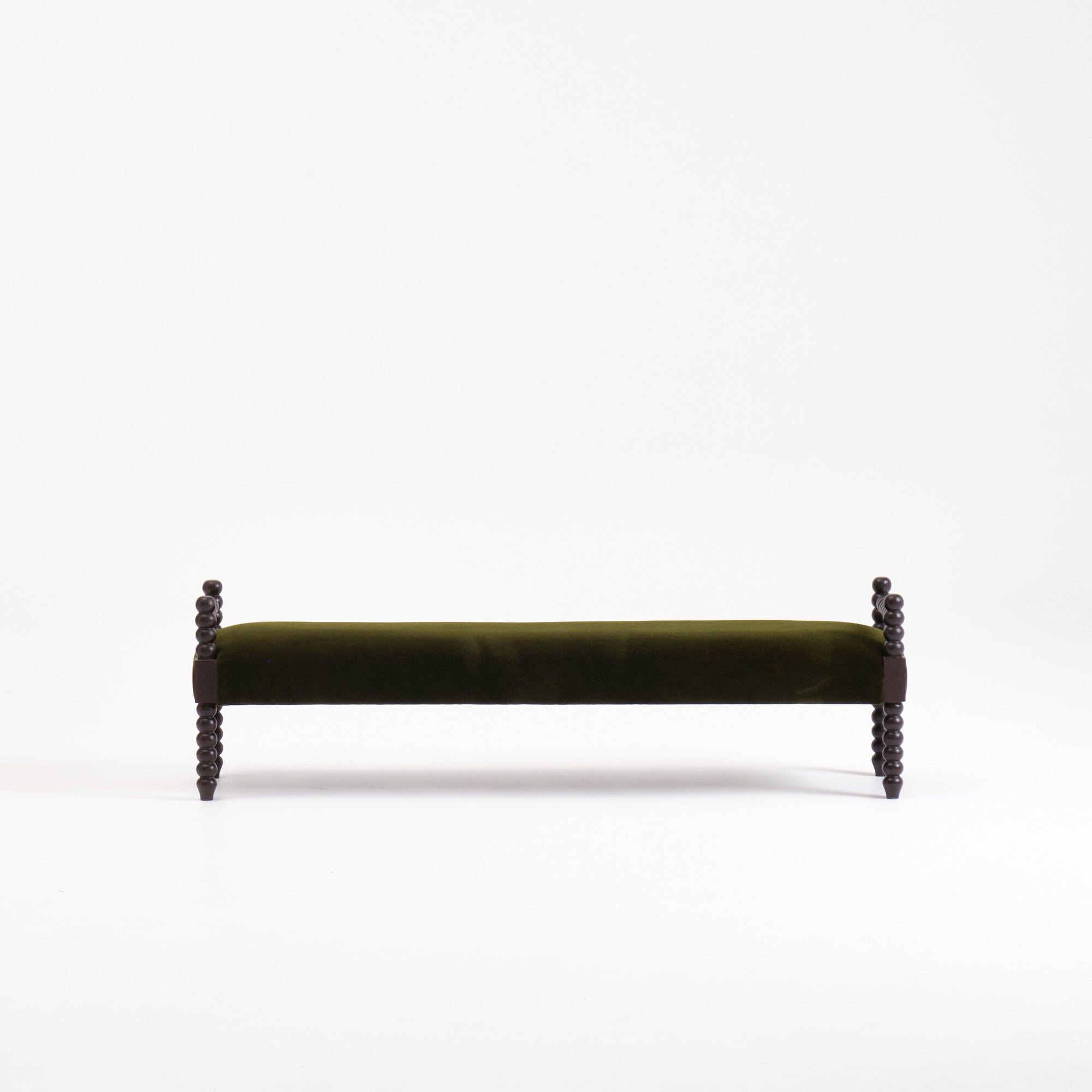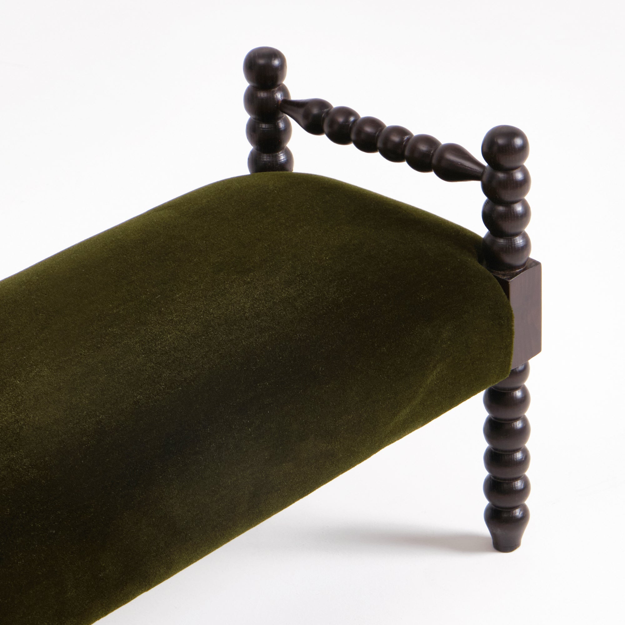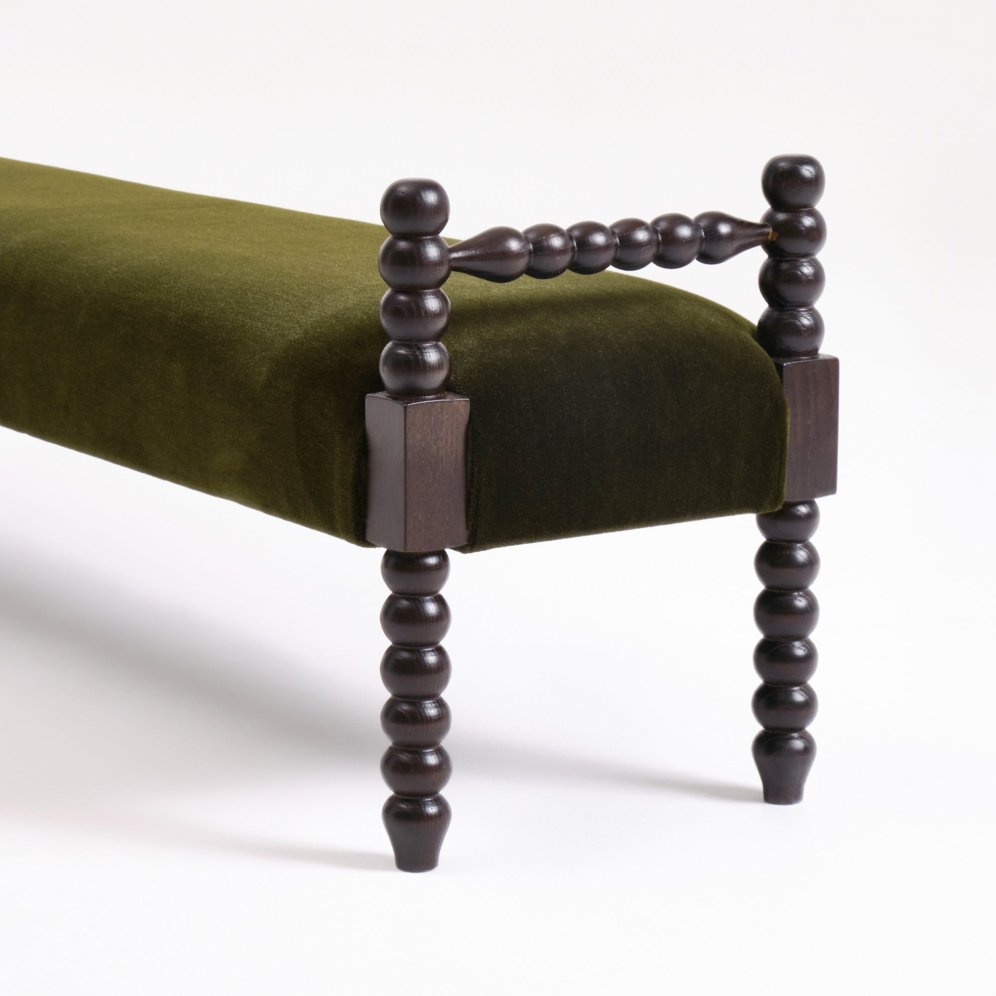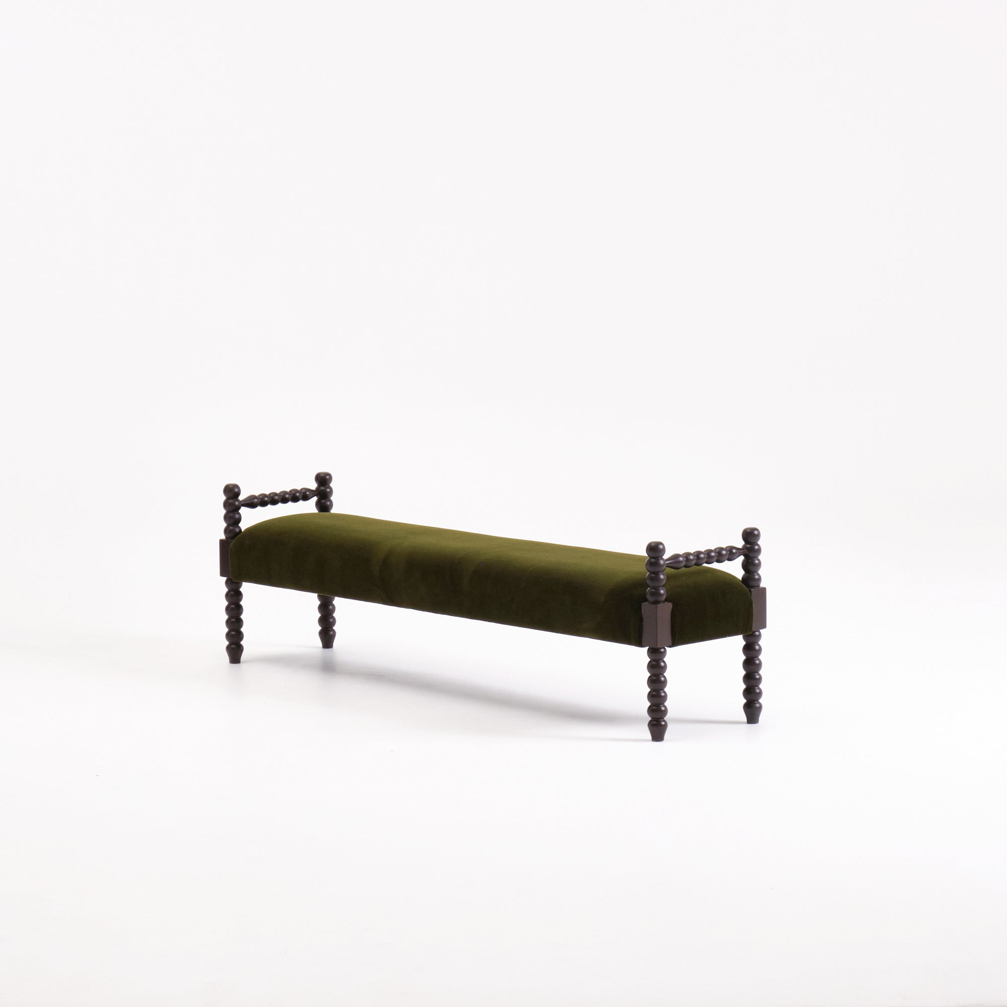 This bench is part of the Bolha series with elegant wood-turned detailing and upholstered seat. Crafted by skilled artisans in Northern Portugal.