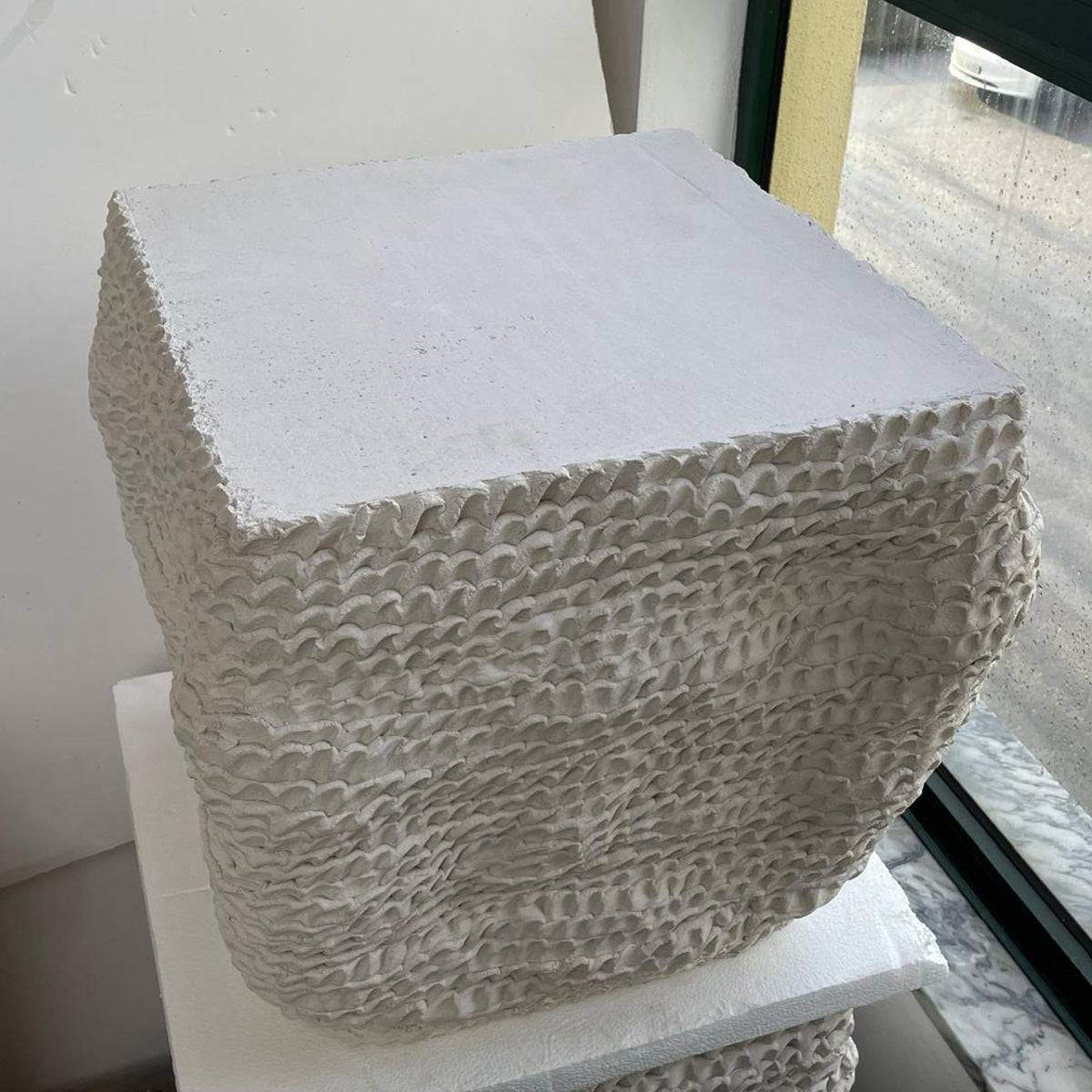 Hand-sculpted ceramic stool with a textured petal finish and padded leather cushion.