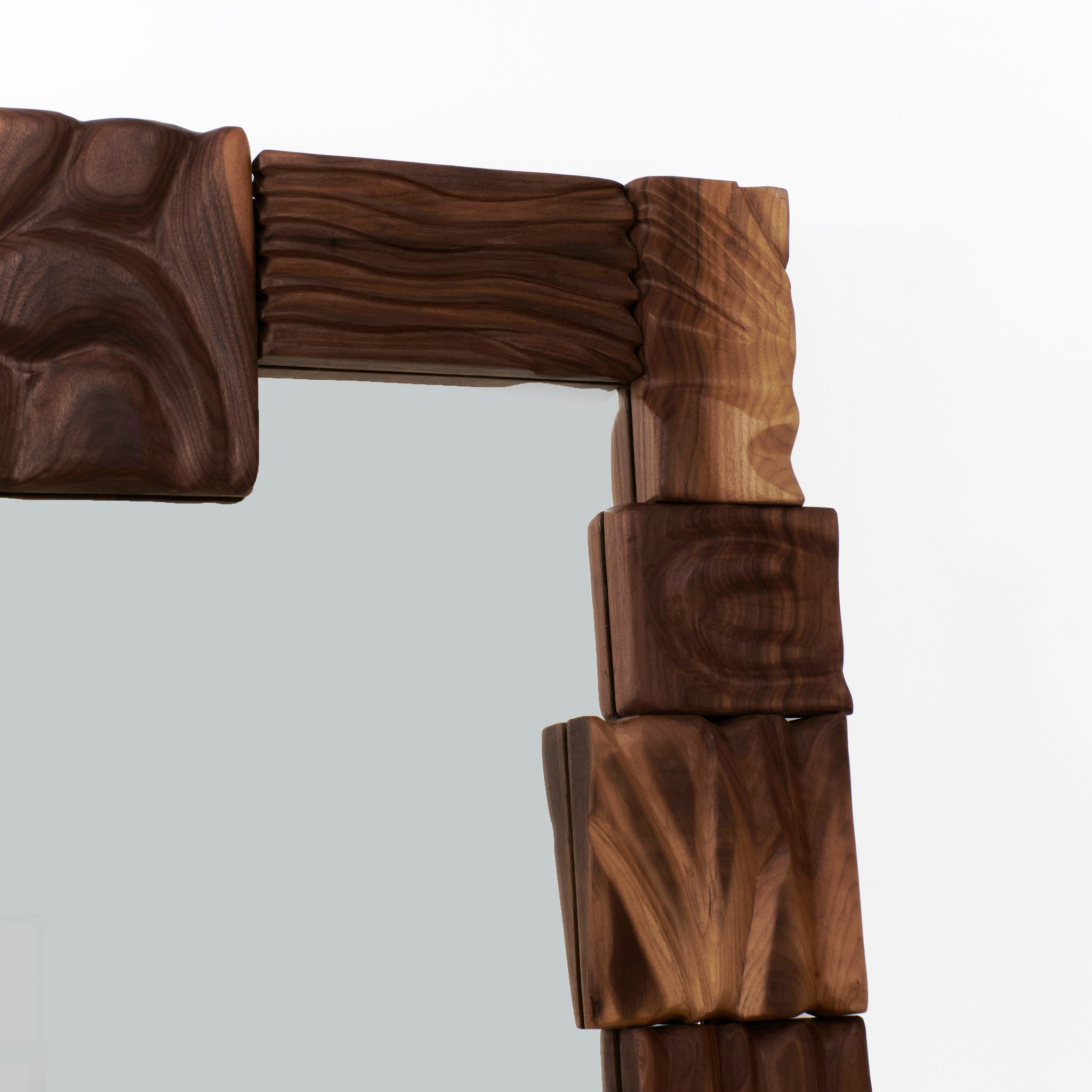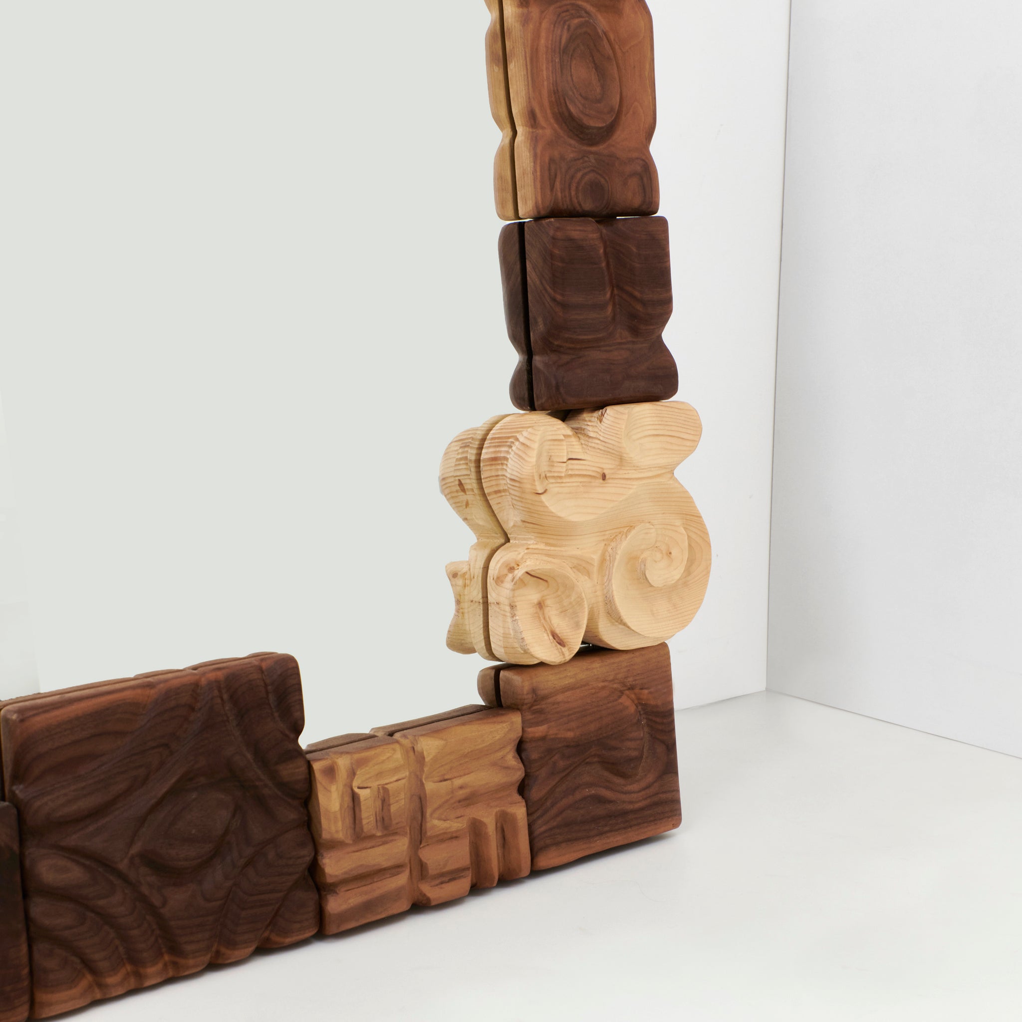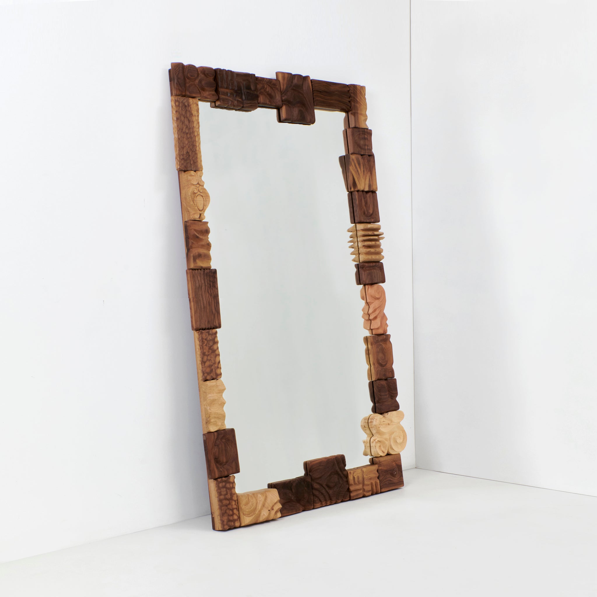 Large wall leaning mirror with a decorative frame made from hand-carved ornamental wood blocks. Each piece, crafted from a variety of wood types such as oak, cedar and walnut is unique.