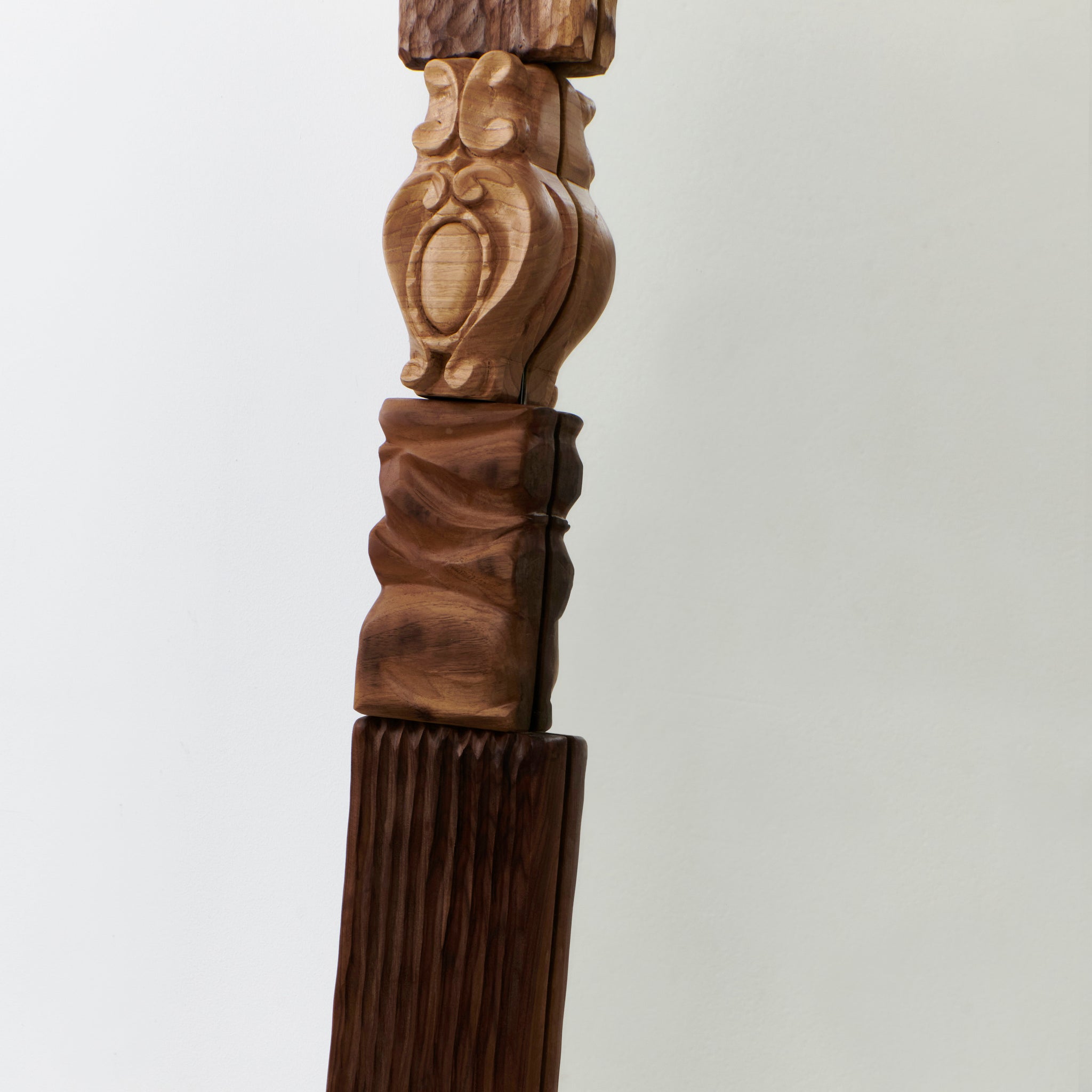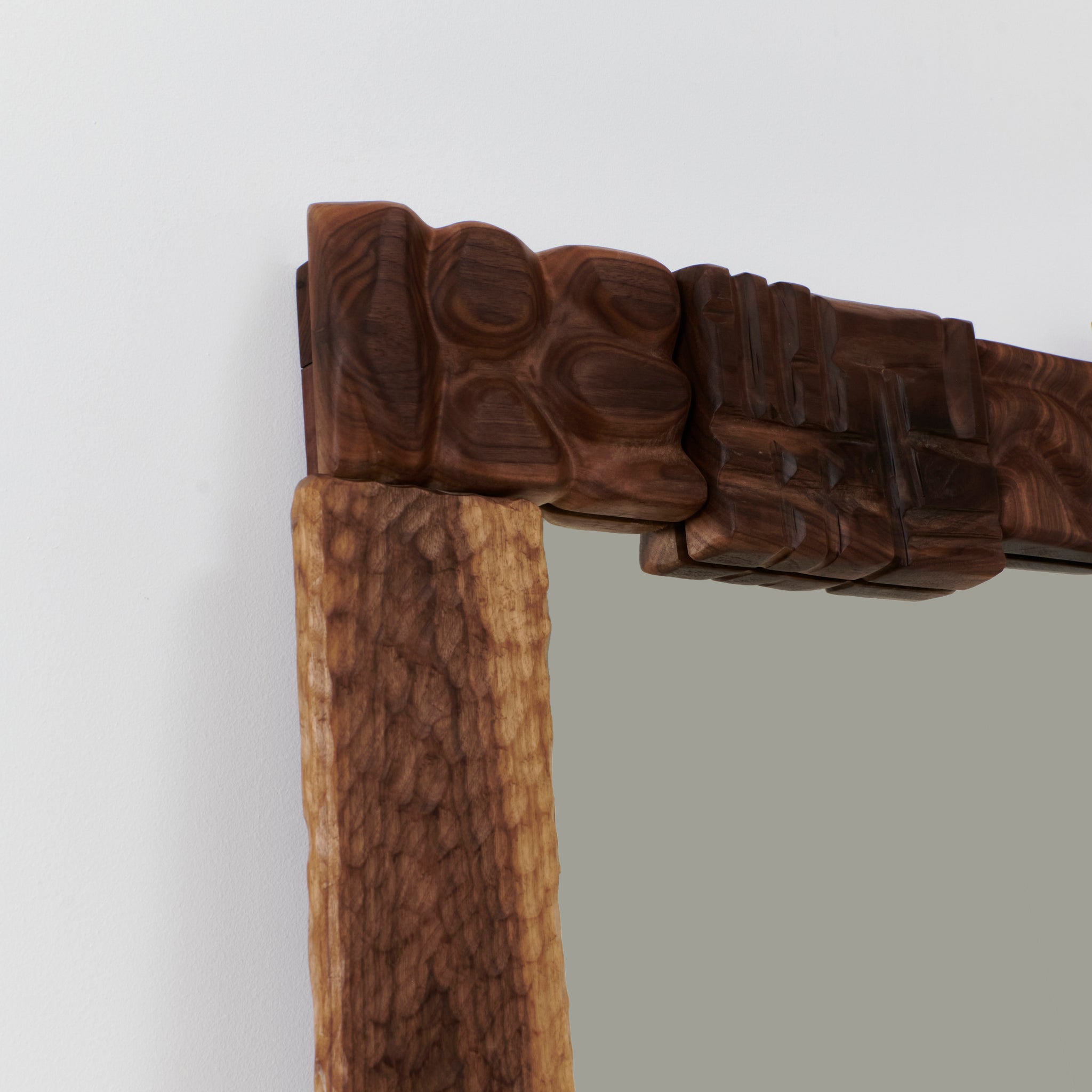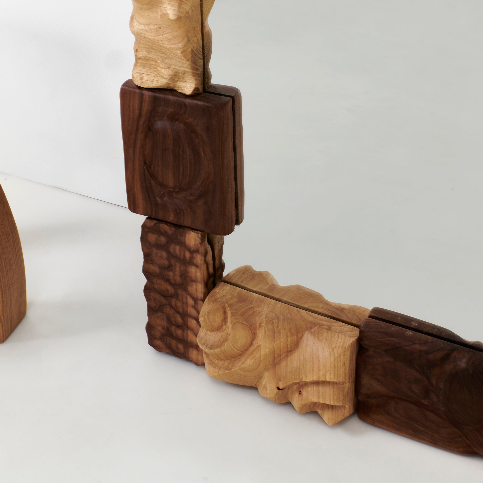 Large wall leaning mirror with a decorative frame made from hand-carved ornamental wood blocks. Each piece, crafted from a variety of wood types such as oak, cedar and walnut is unique.