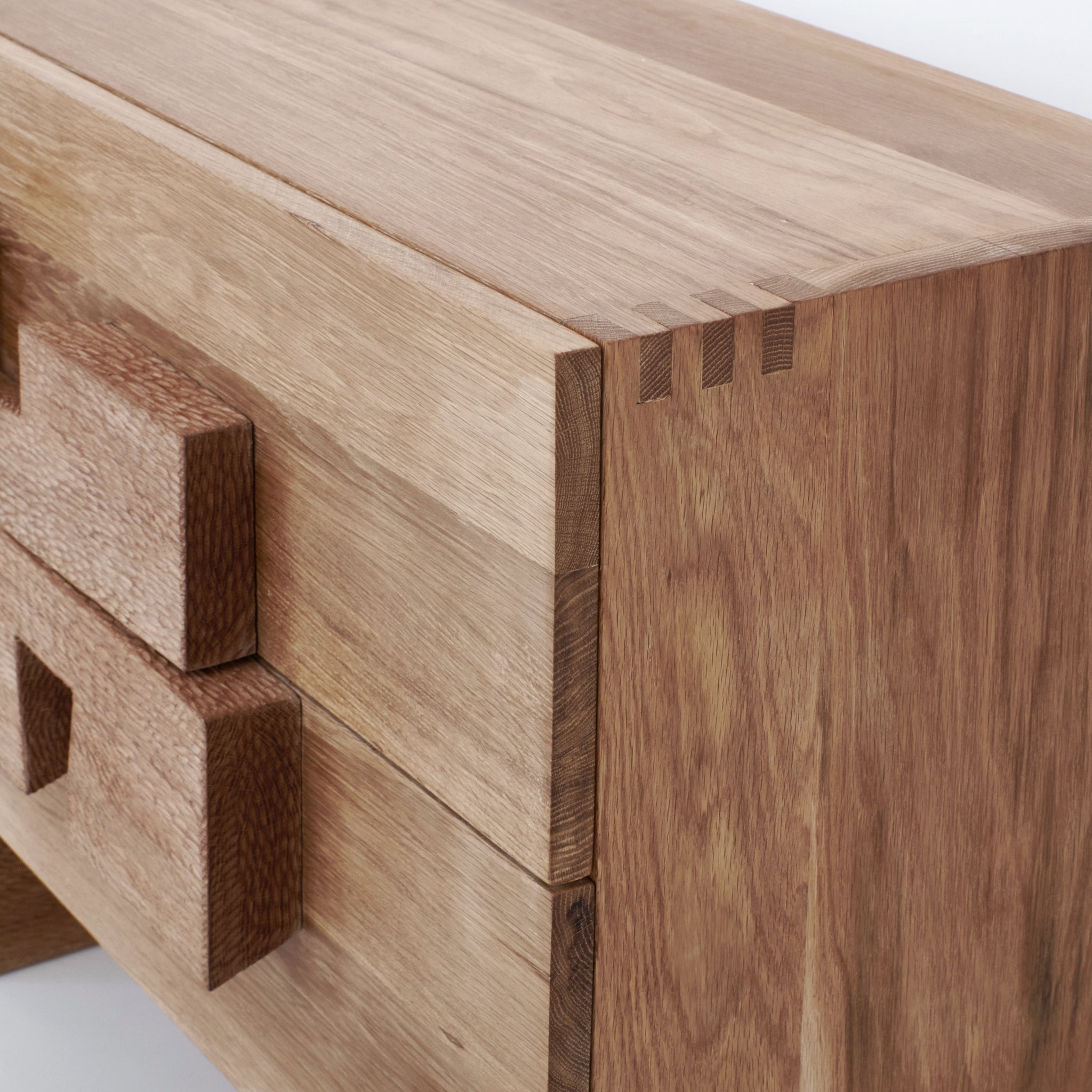 Handmade by skilled artisans in solid oak. The bedside table features two drawers with handles and legs decorated with a hand carved texture.