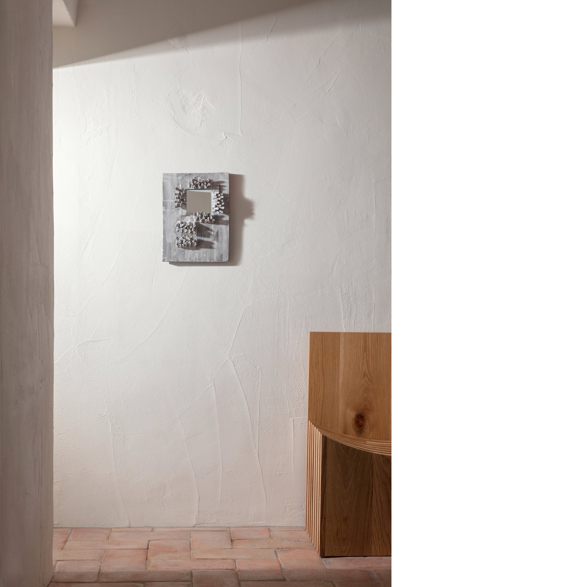 Artisanal ceramic mirror is crafted by skilled artisans in Project 213A's own ceramic workshop. The frame is decorated with sculptural finger ornaments and has two small mirrors.