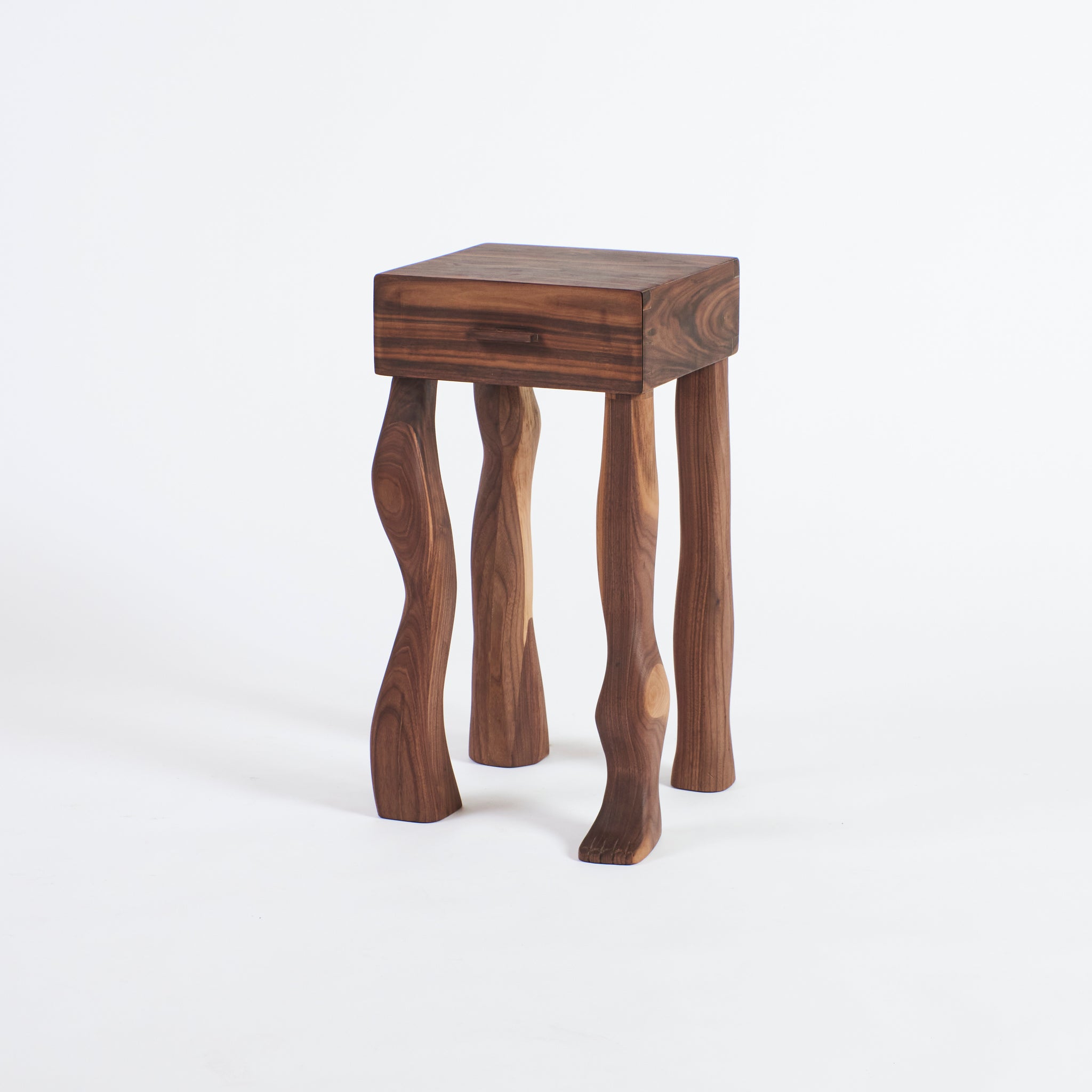 The Foot side tables is part of the "Foot collection" which is all hand-carved by skilled artisans in Northern Portugal. The tables is made from solid walnut with carefully designed jointing details. The drawer stands on four irregular legs out of which one has a foot. The piece is available to order as single or as a pair.