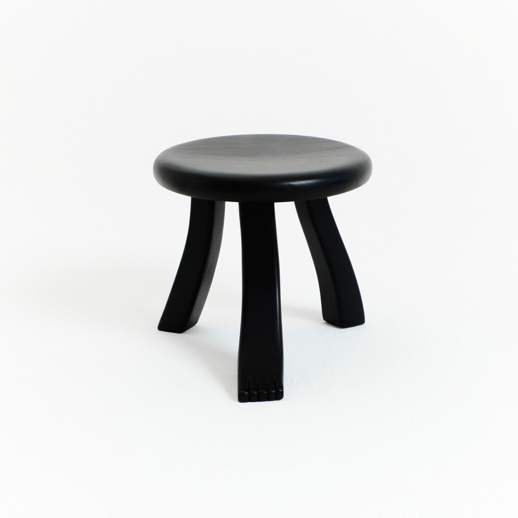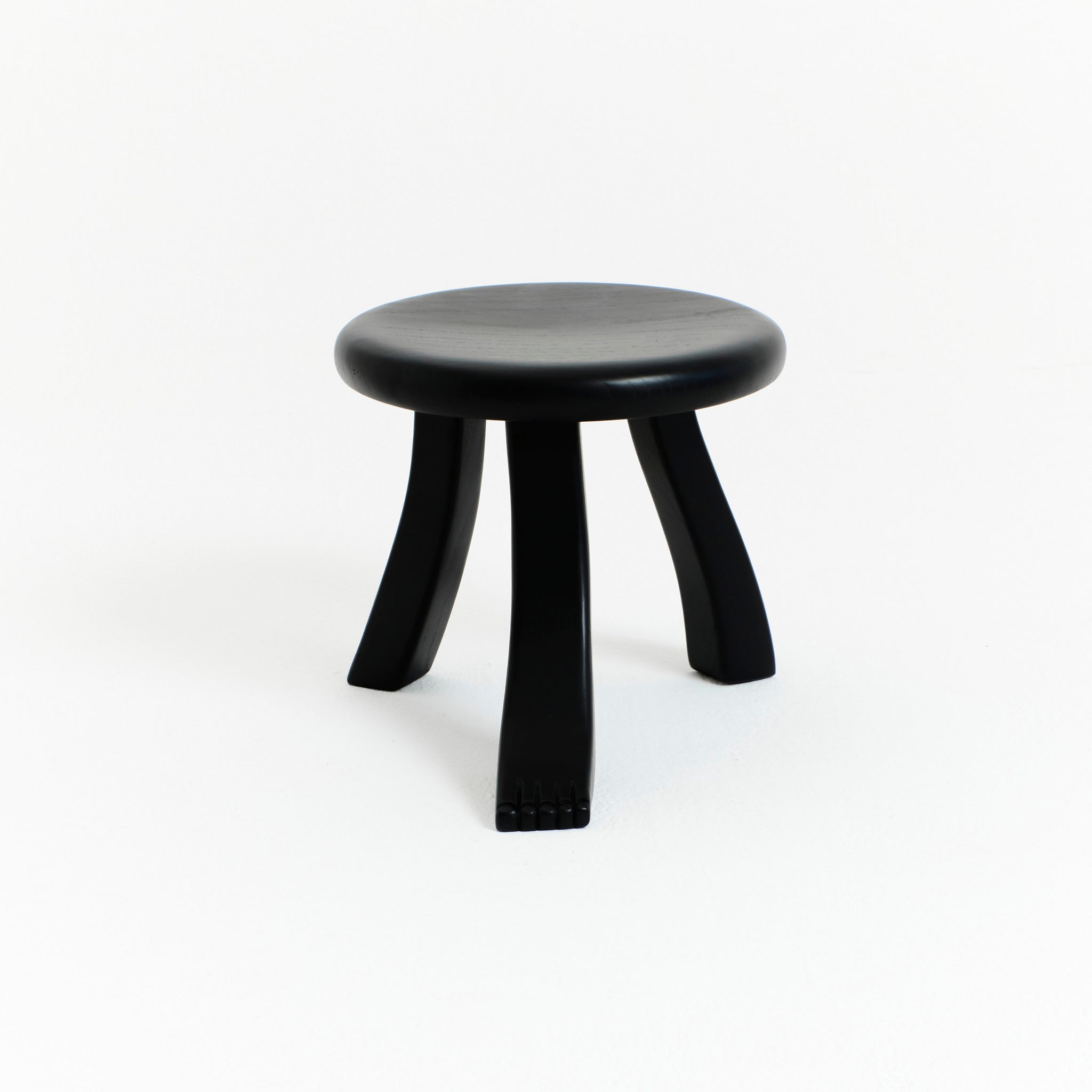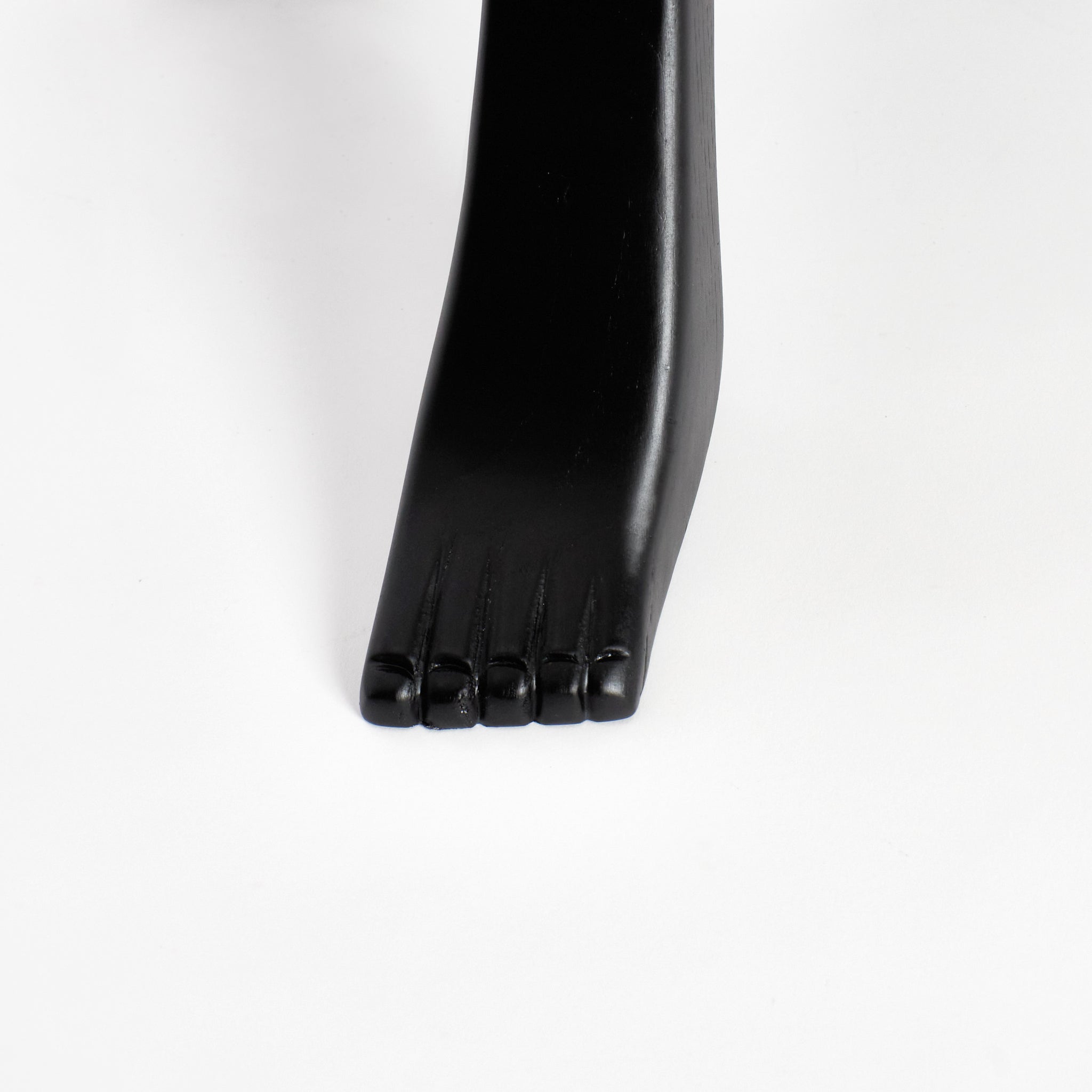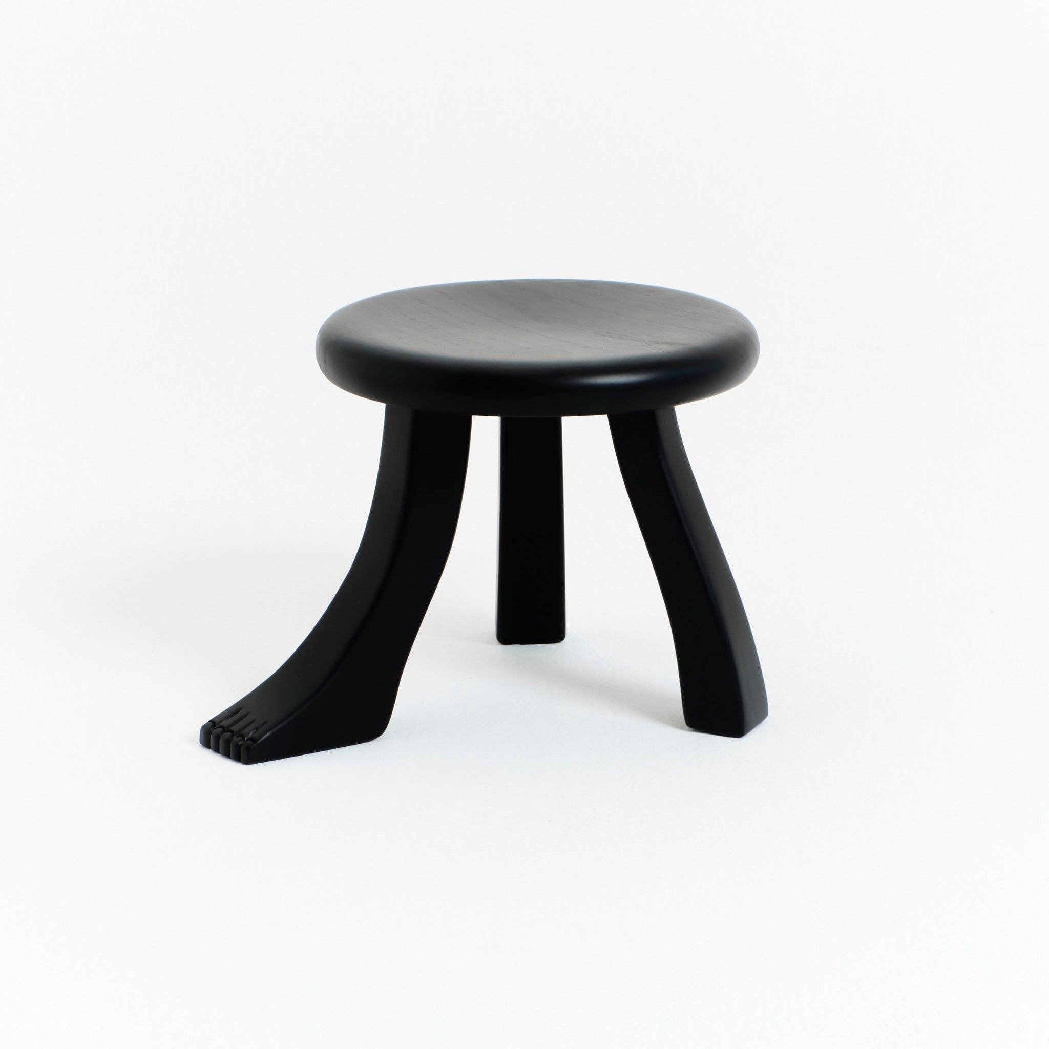 The Foot is part of the "Foot collection" and is hand-carved by skilled artisans from solid chestnut and varnished in black. The design was inspired by a traditional milking stool which stands on three individually shaped legs of which one has a foot.