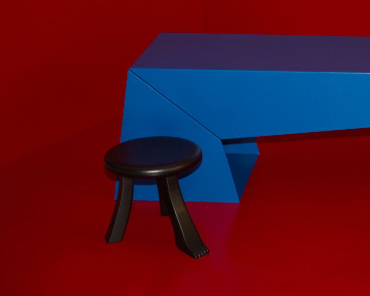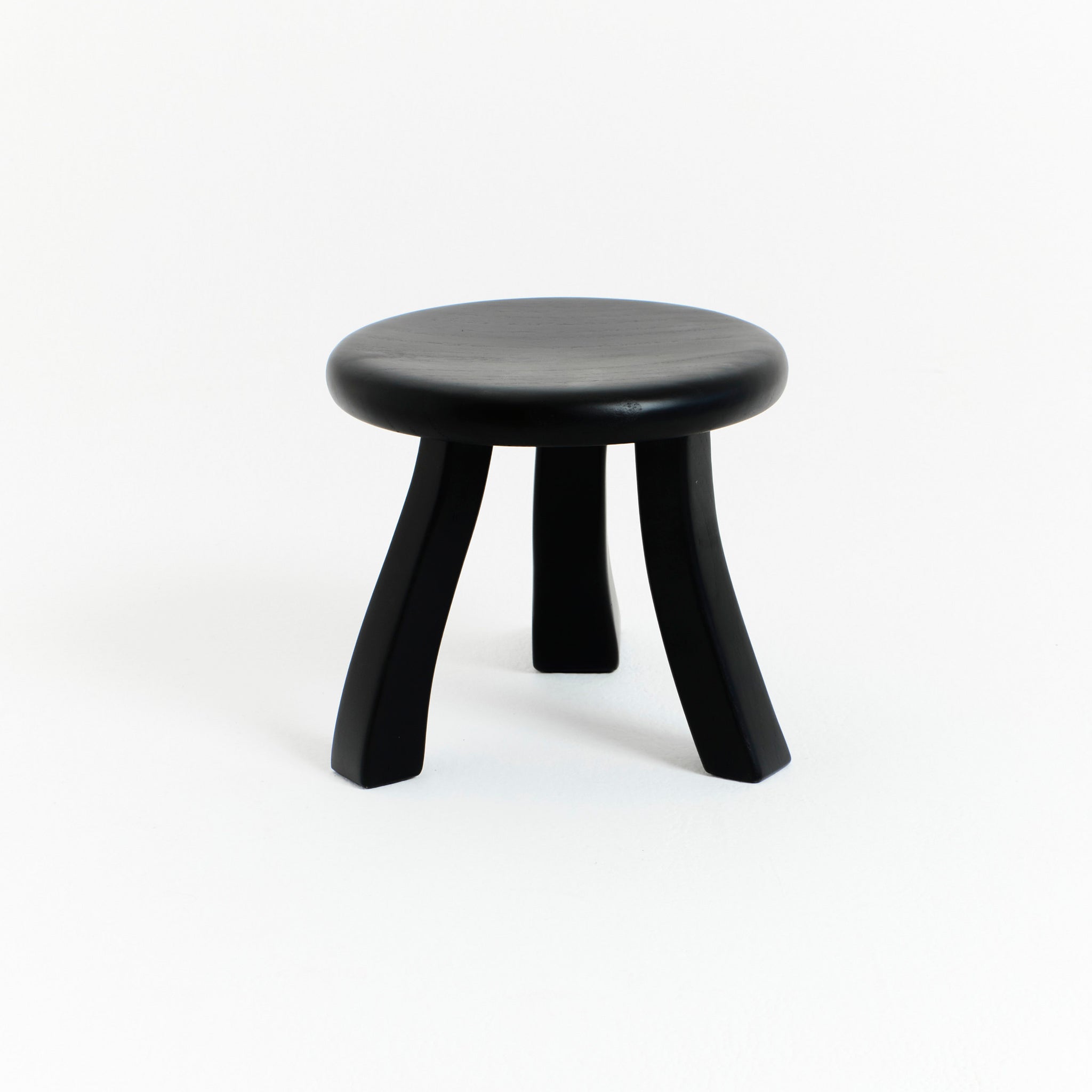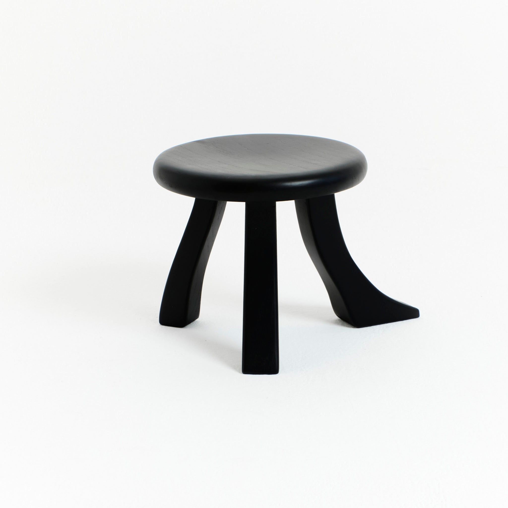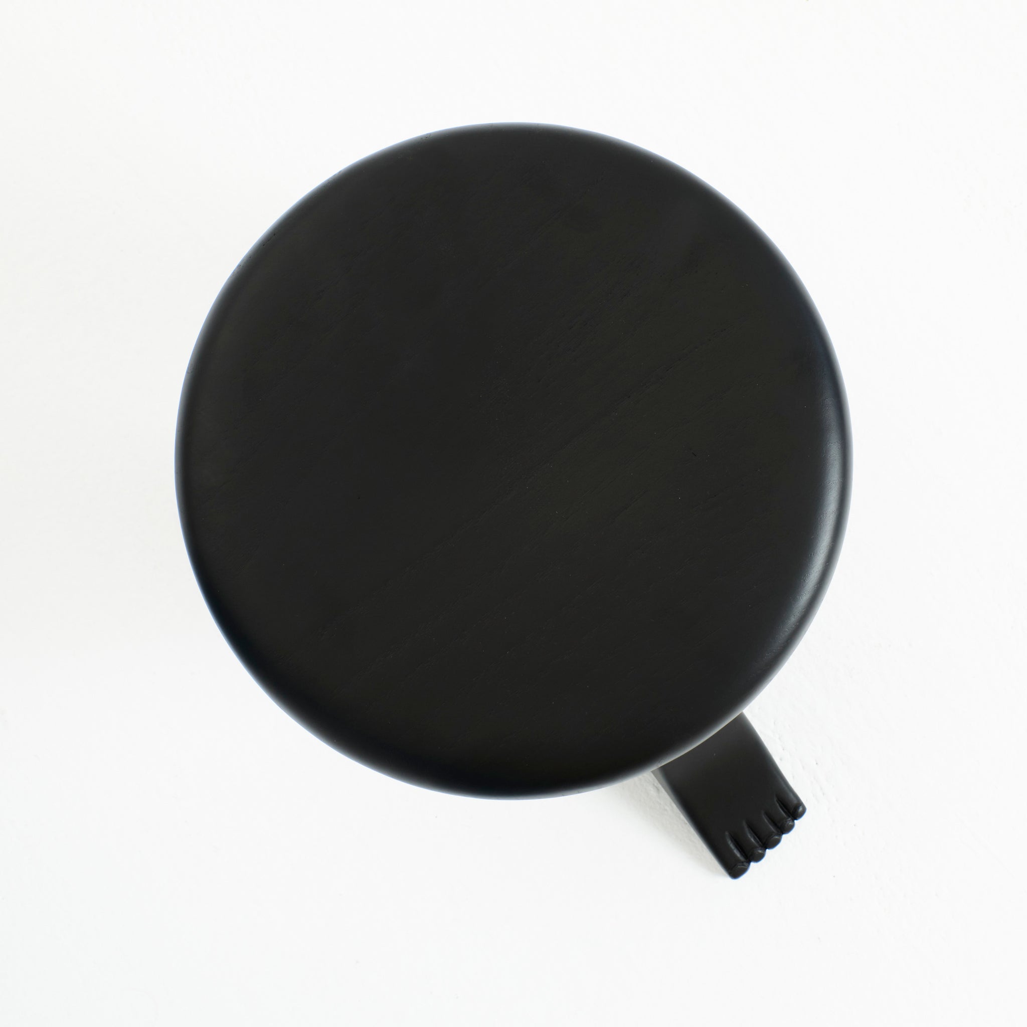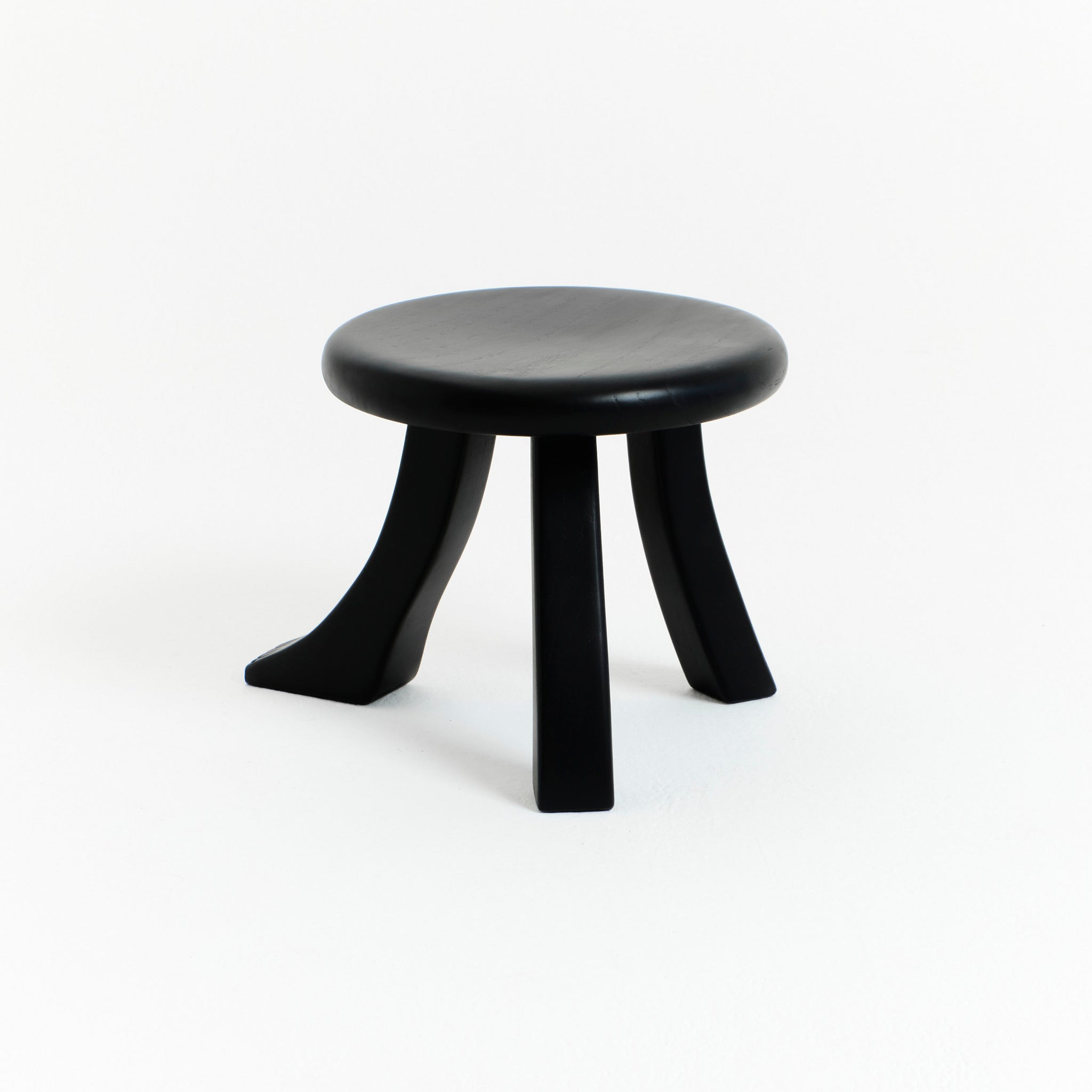 The Foot is part of the "Foot collection" and is hand-carved by skilled artisans from solid chestnut and varnished in black. The design was inspired by a traditional milking stool which stands on three individually shaped legs of which one has a foot.