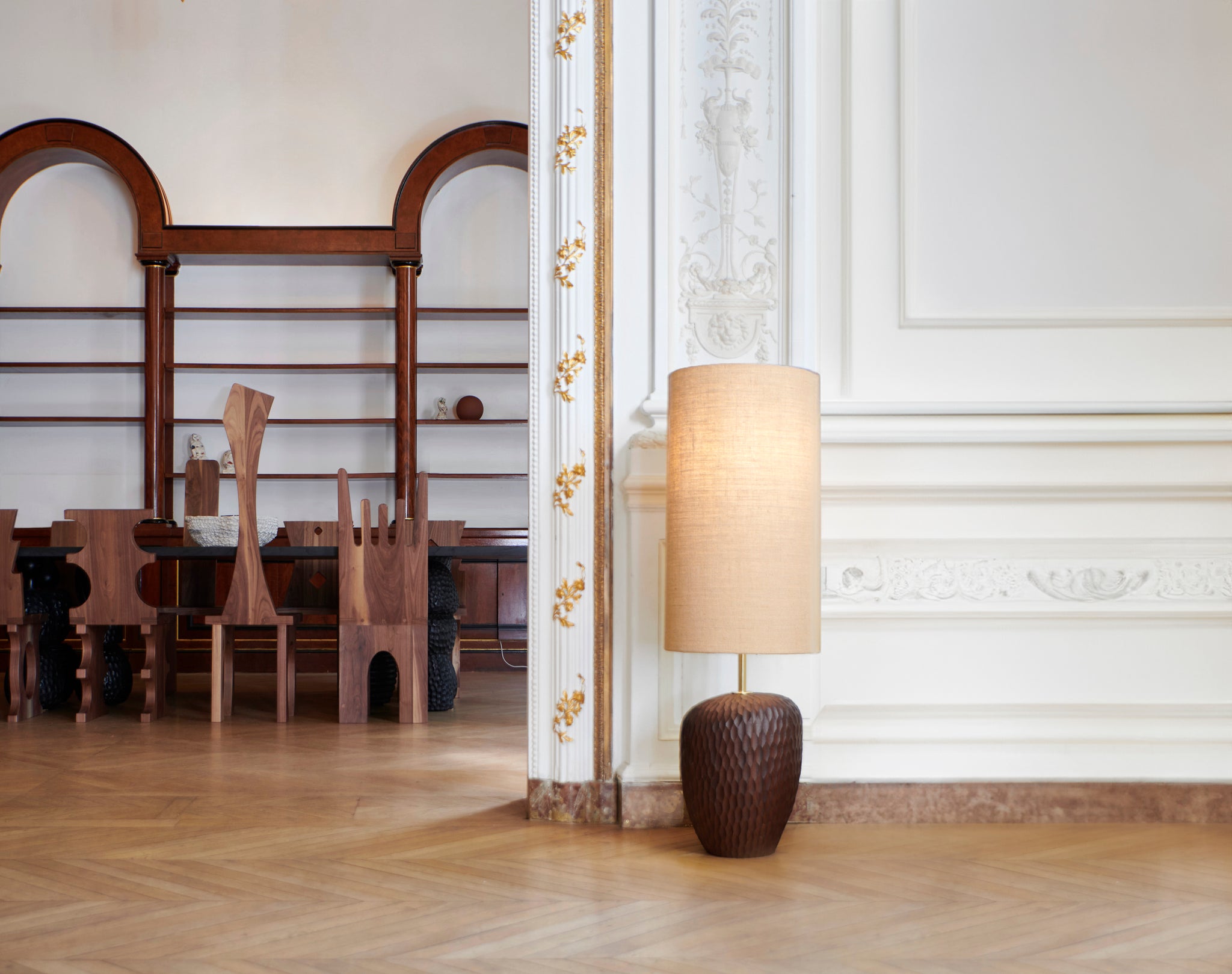 Large artisanal floor light with an organic shape, carved from solid wood in Project 213A's own workshop. Each piece is unique due to its handmade nature, shapes and shades vary slightly. Bespoke dimensions available upon request. To view wood and lampshade options for this item please contact us.