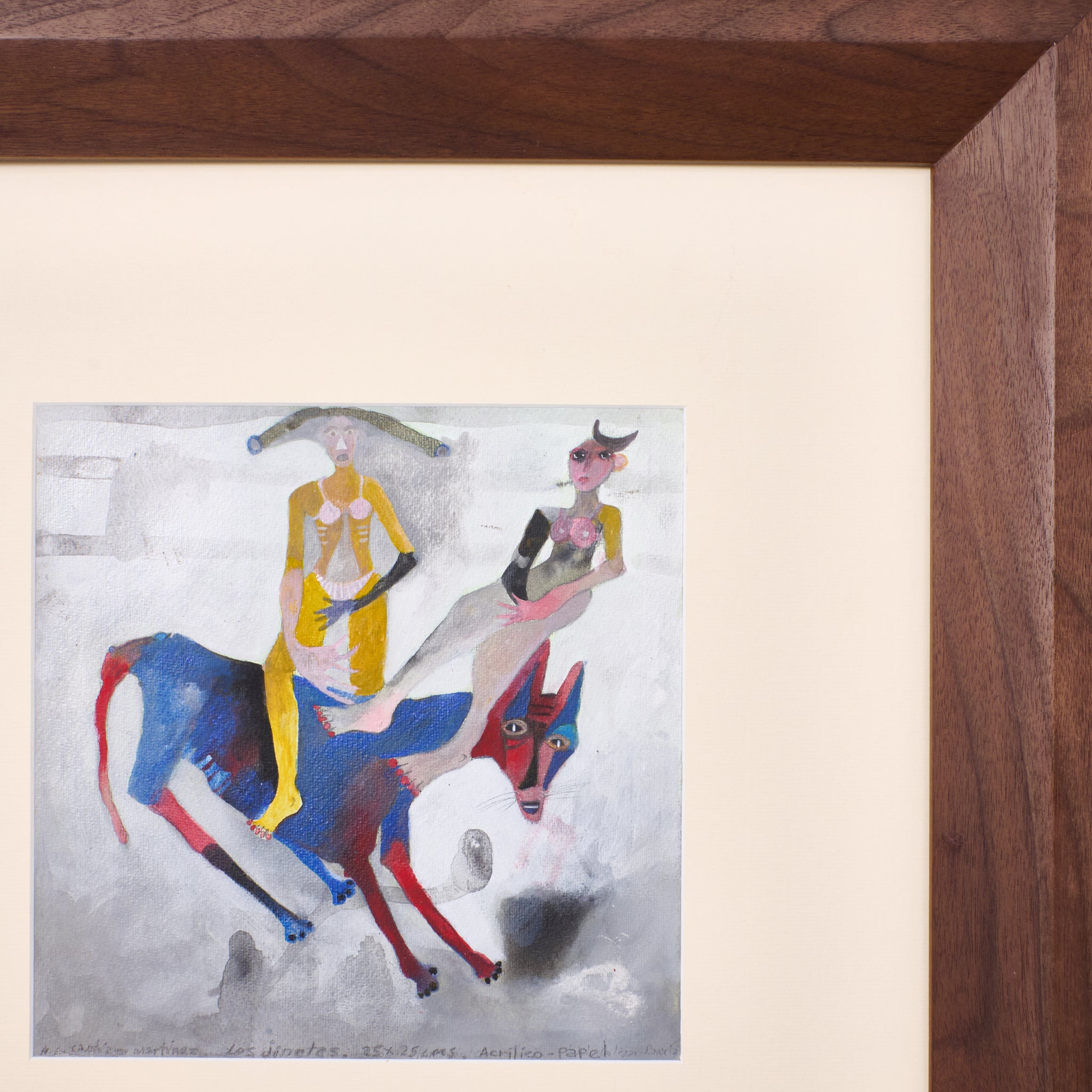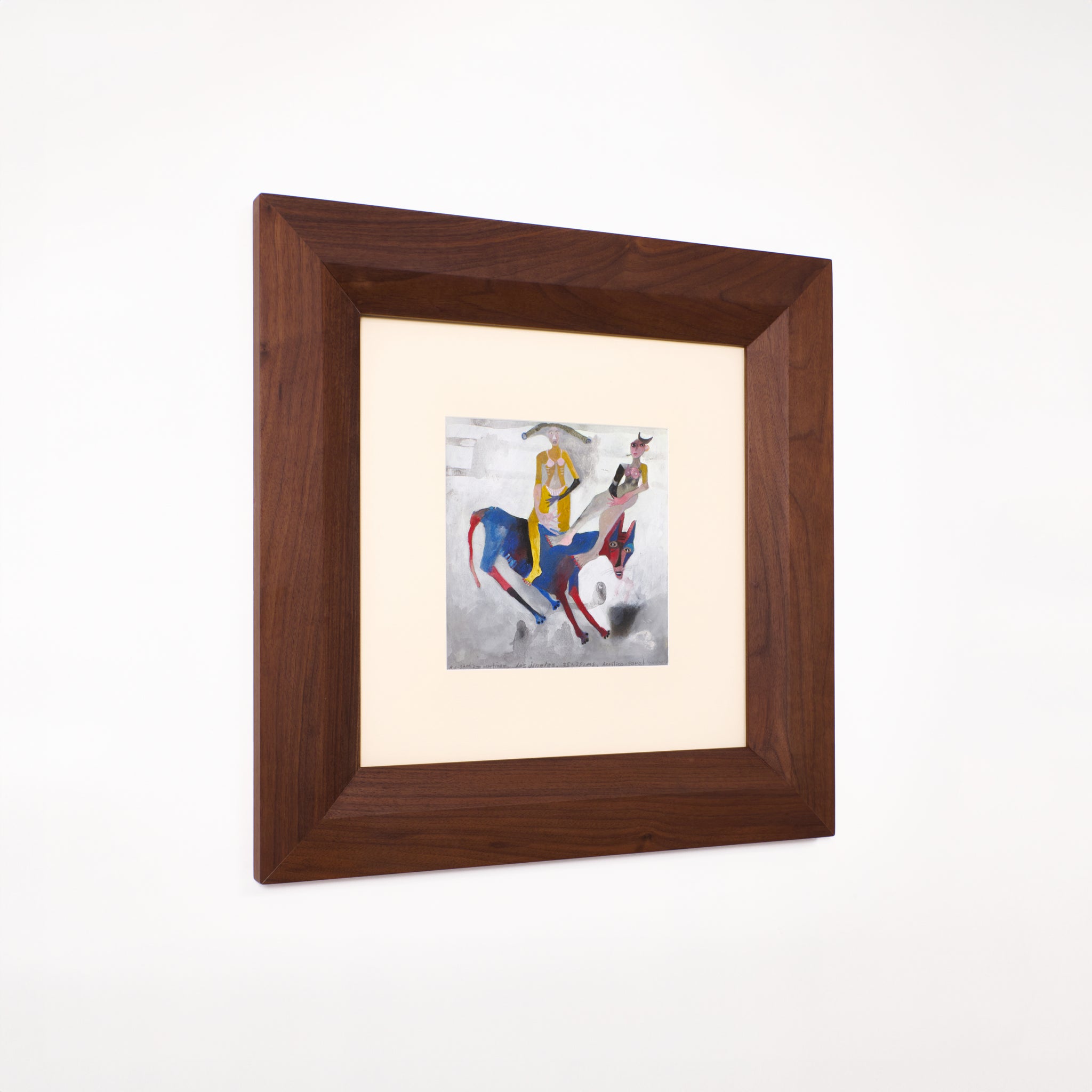 Acrylic paint on paper, handcrafted gouged walnut wood frame.