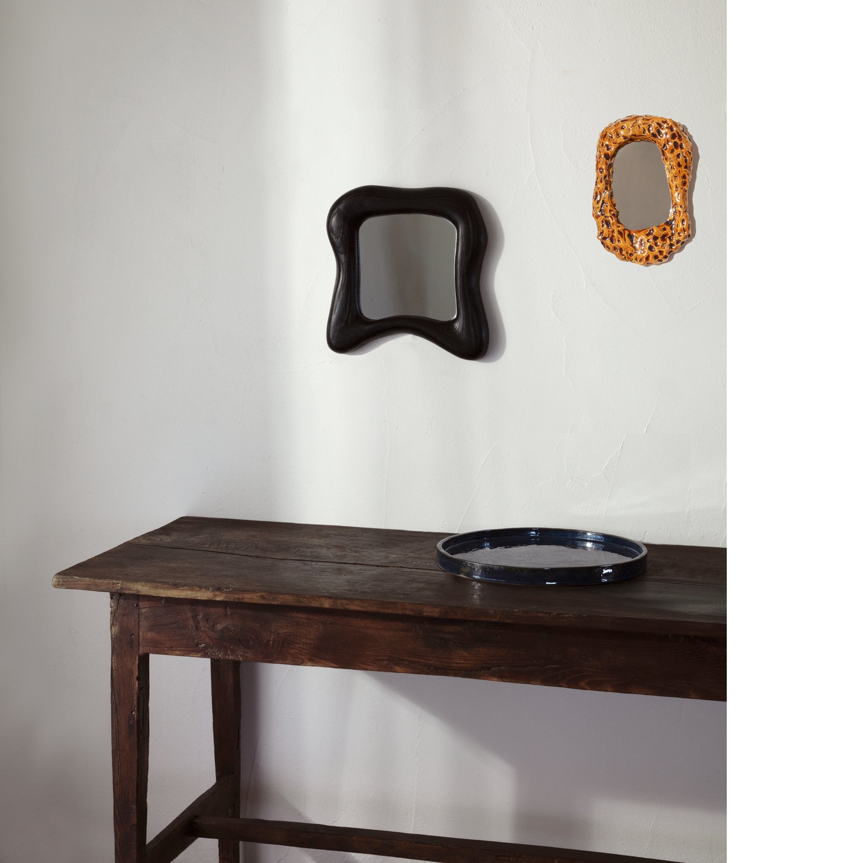 The Minho mirror is framed in solid chestnut wood with an abstract organic shape. Crafted by skilled artisans in Northern Portugal.