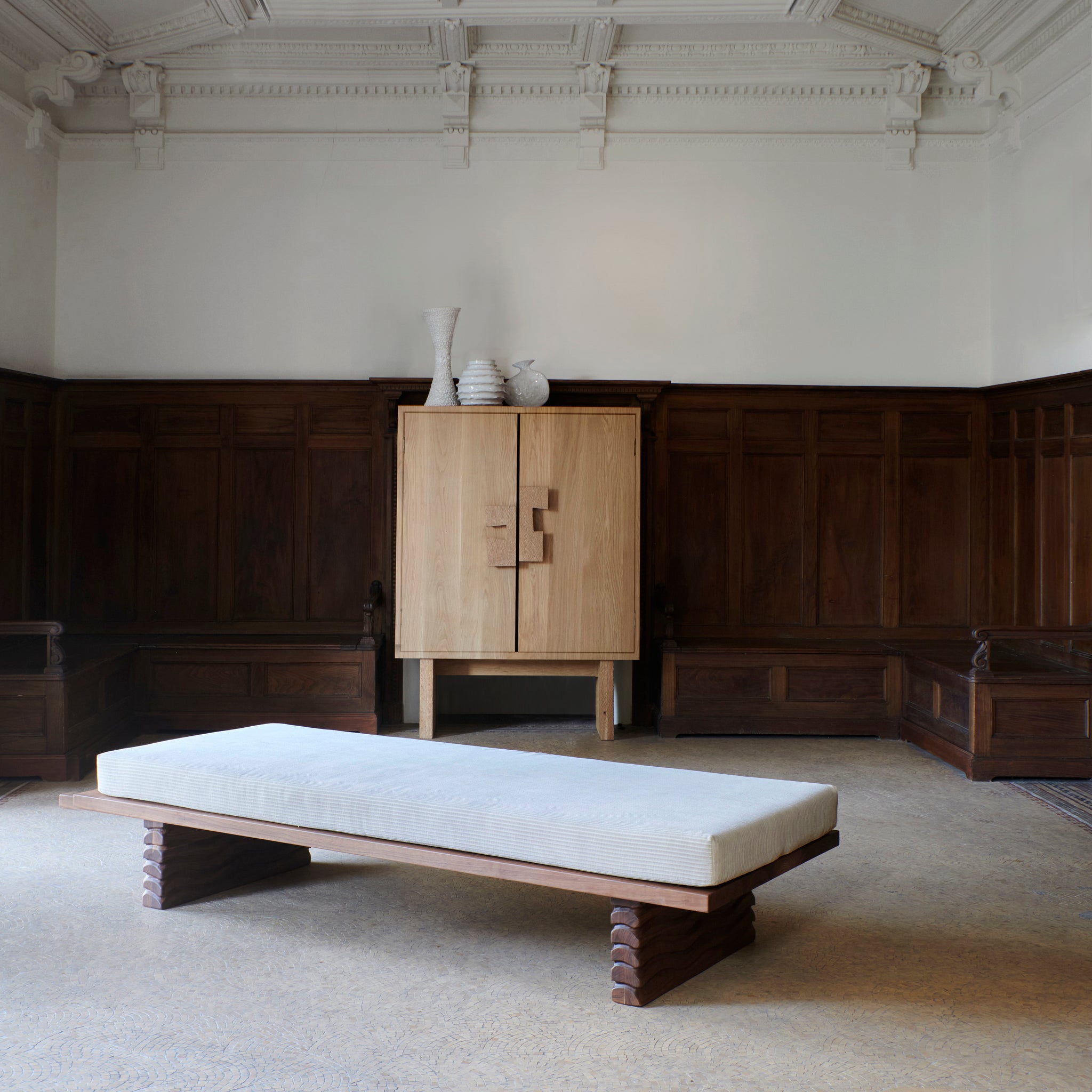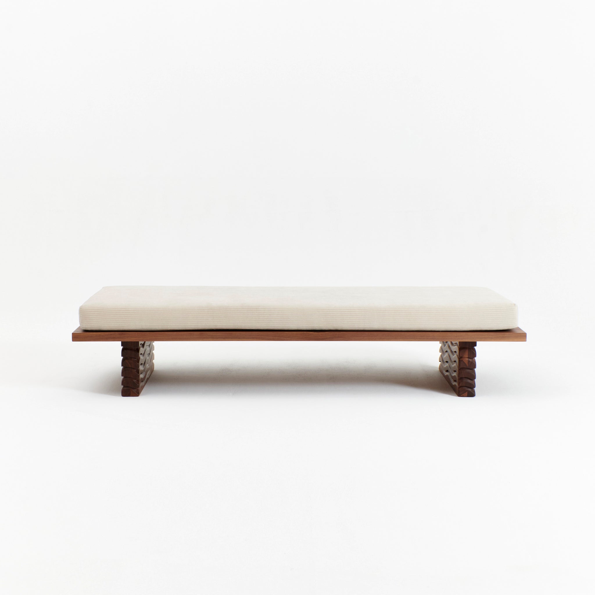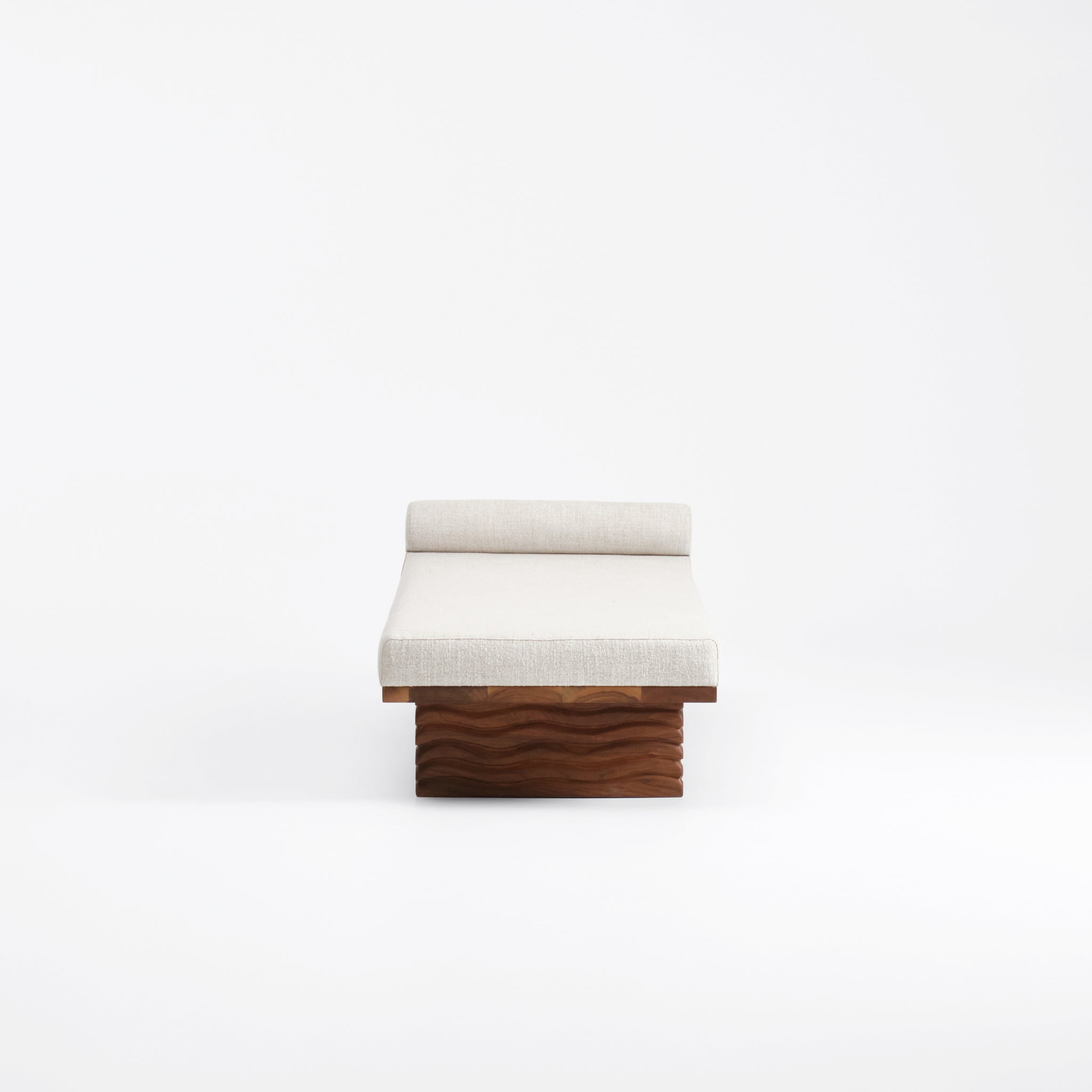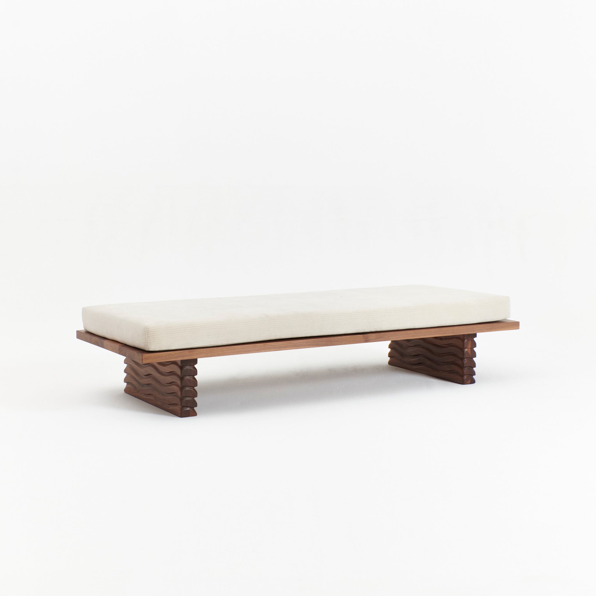 The Nazaré Daybed is crafted from solid walnut and has a removable cushion. The legs have a hand-carved detailed wave texture giving the piece it's name.