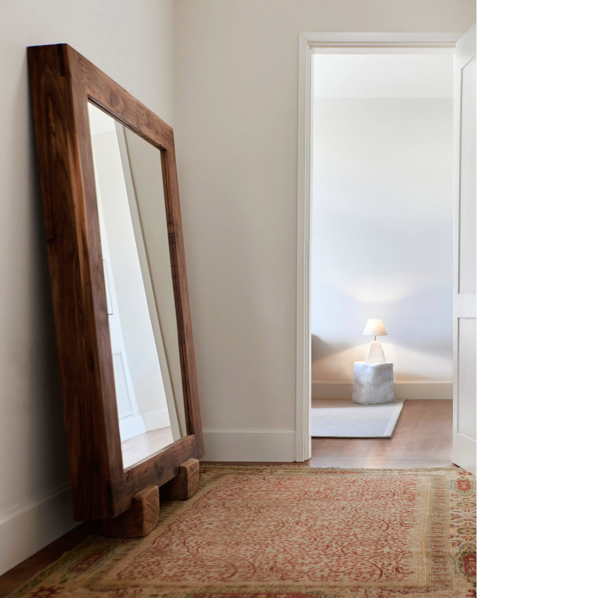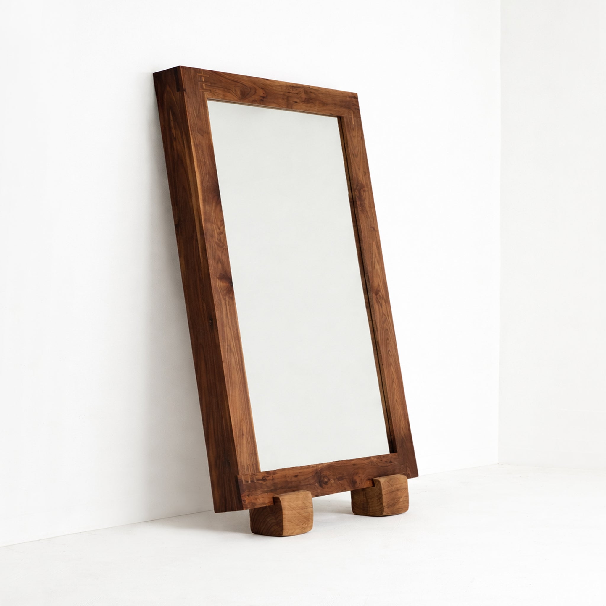 Large wall-leaning mirror in solid walnut on block legs made from cedar wood. The edges of the frame have elegant jointing details. Handmade in Northern Portugal.