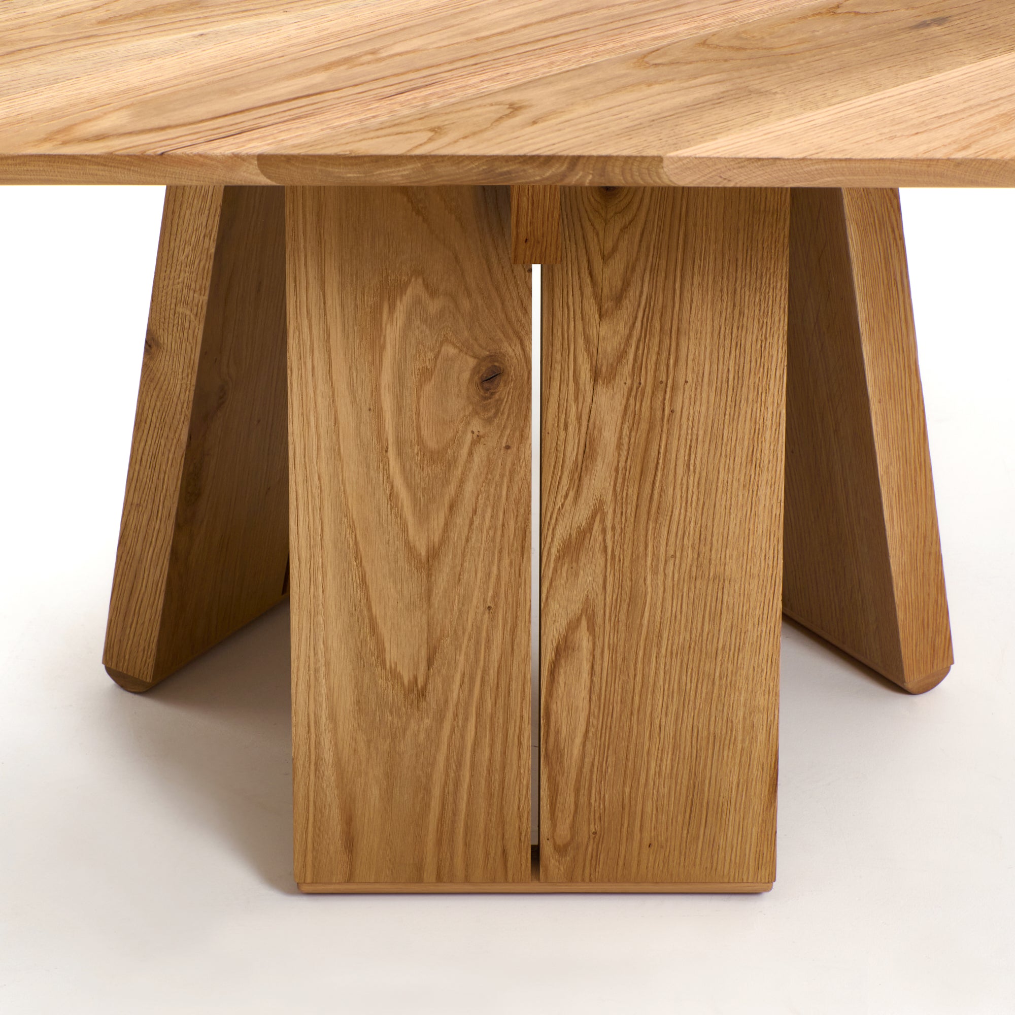 This dining table has an asymmetric triangular table top with rounded edges. Available in custom dimensions. To view our other wood options please contact us directly.
