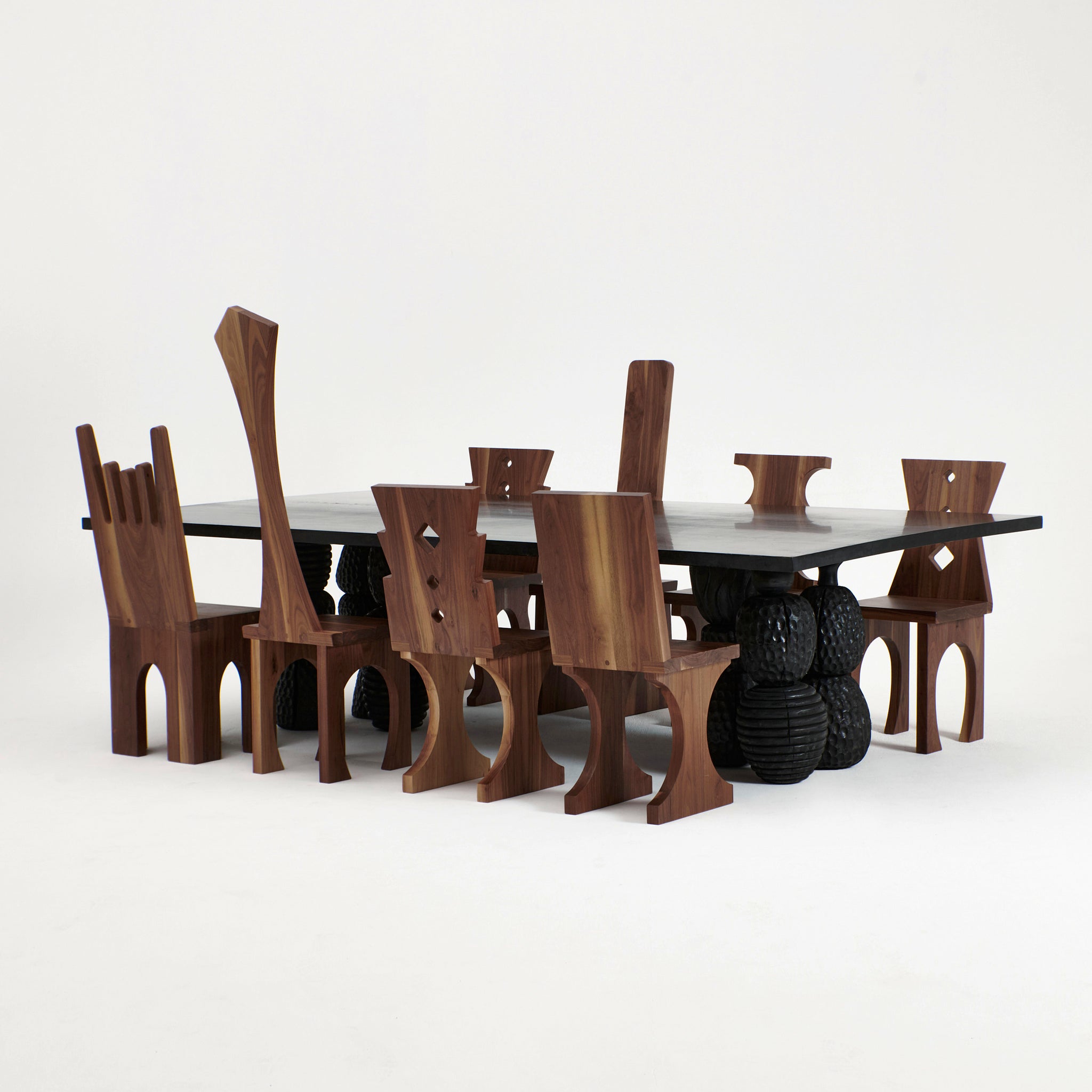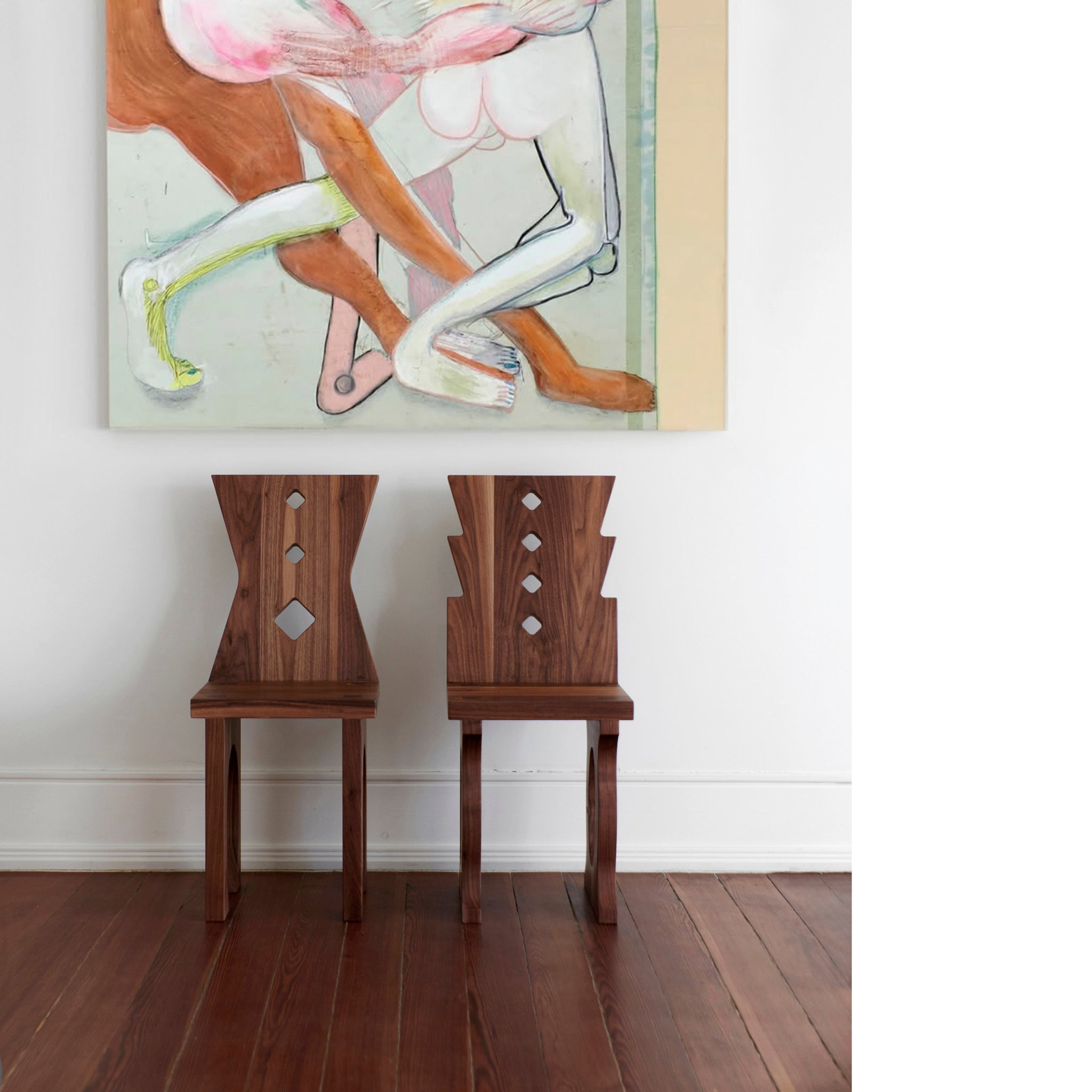 This chair is part of a series with eight different designs with a graphic shaped backrest and structural legs. Crafted from solid walnut by skilled artisans in Northern Portugal.