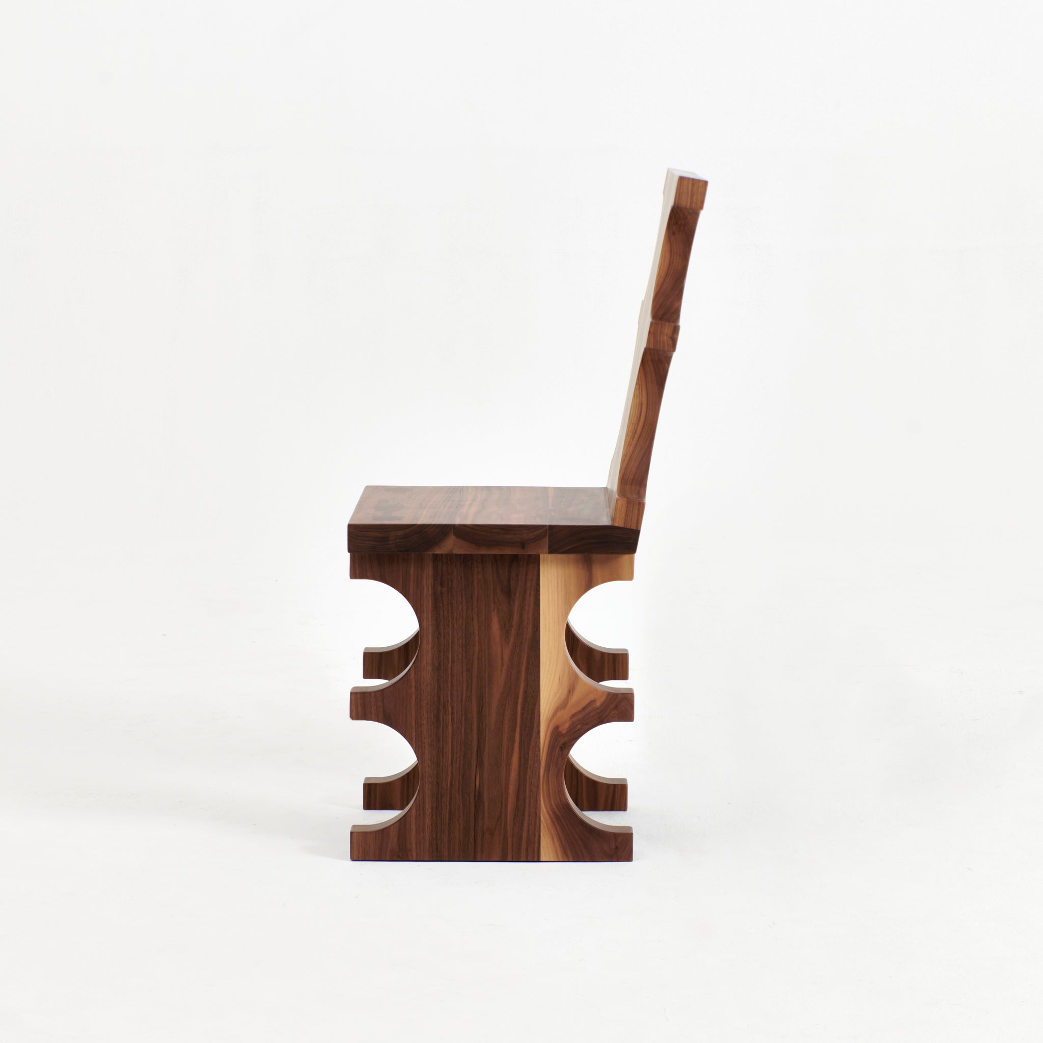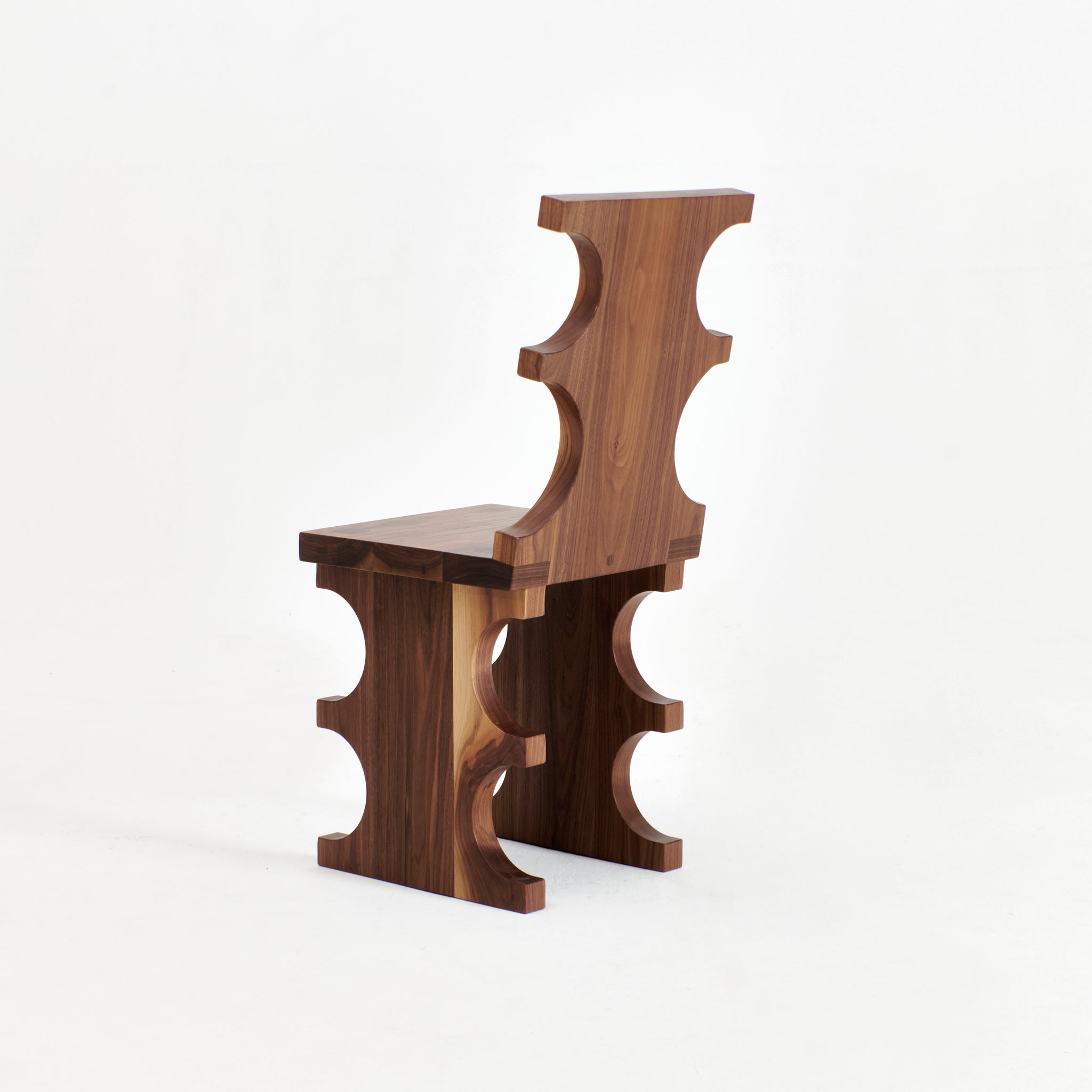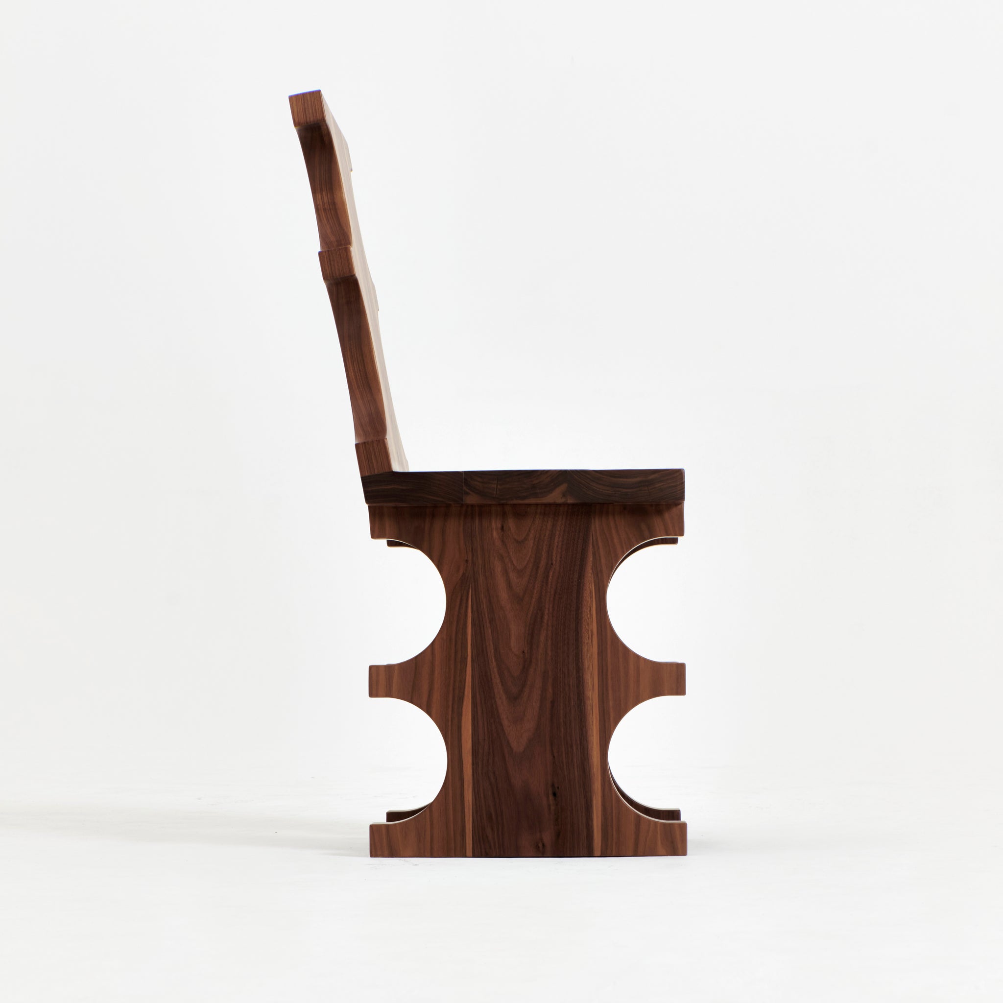 This chair is part of a series with eight different designs with a graphic shaped backrest and structural legs. Crafted from solid walnut by skilled artisans in Northern Portugal.