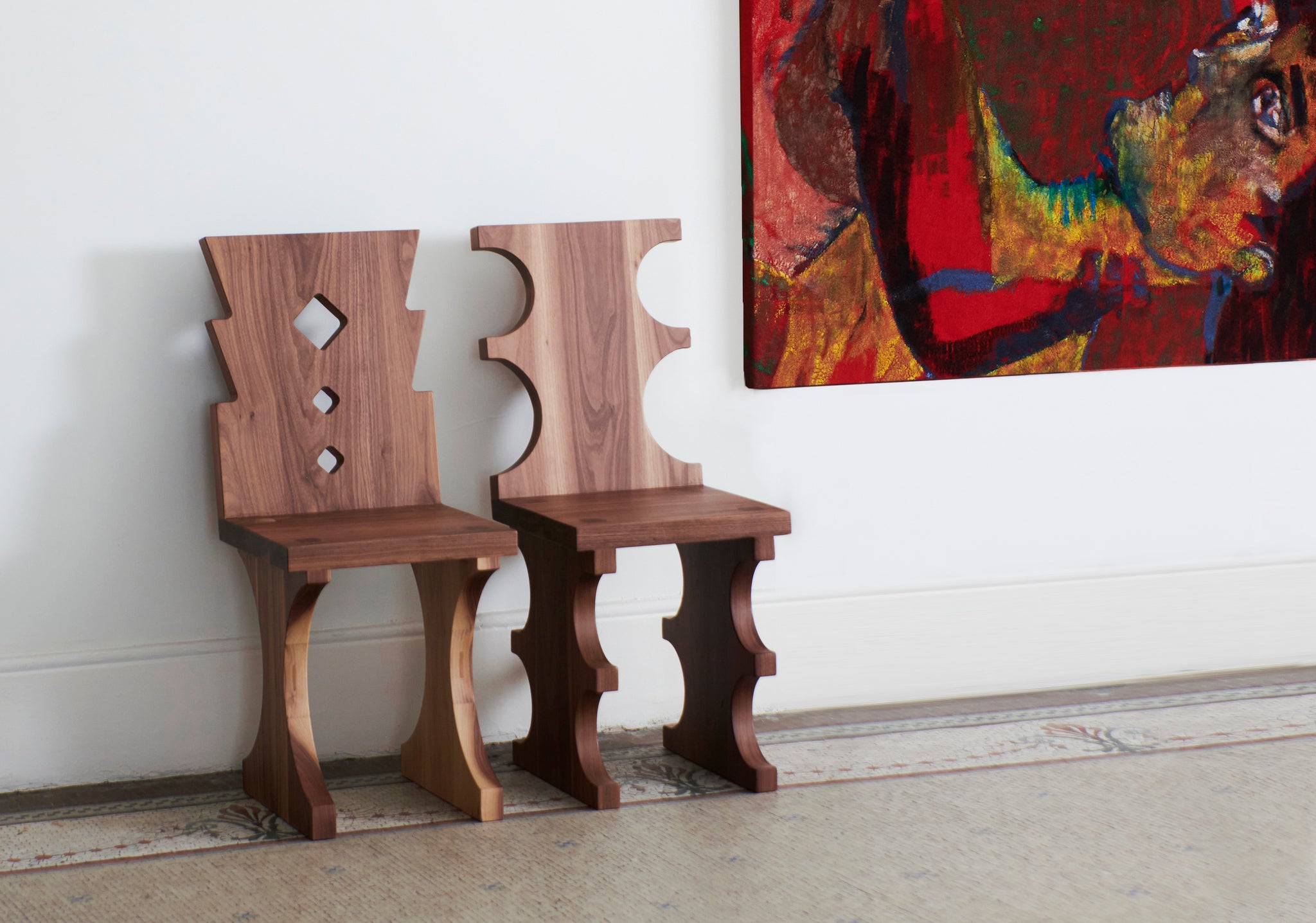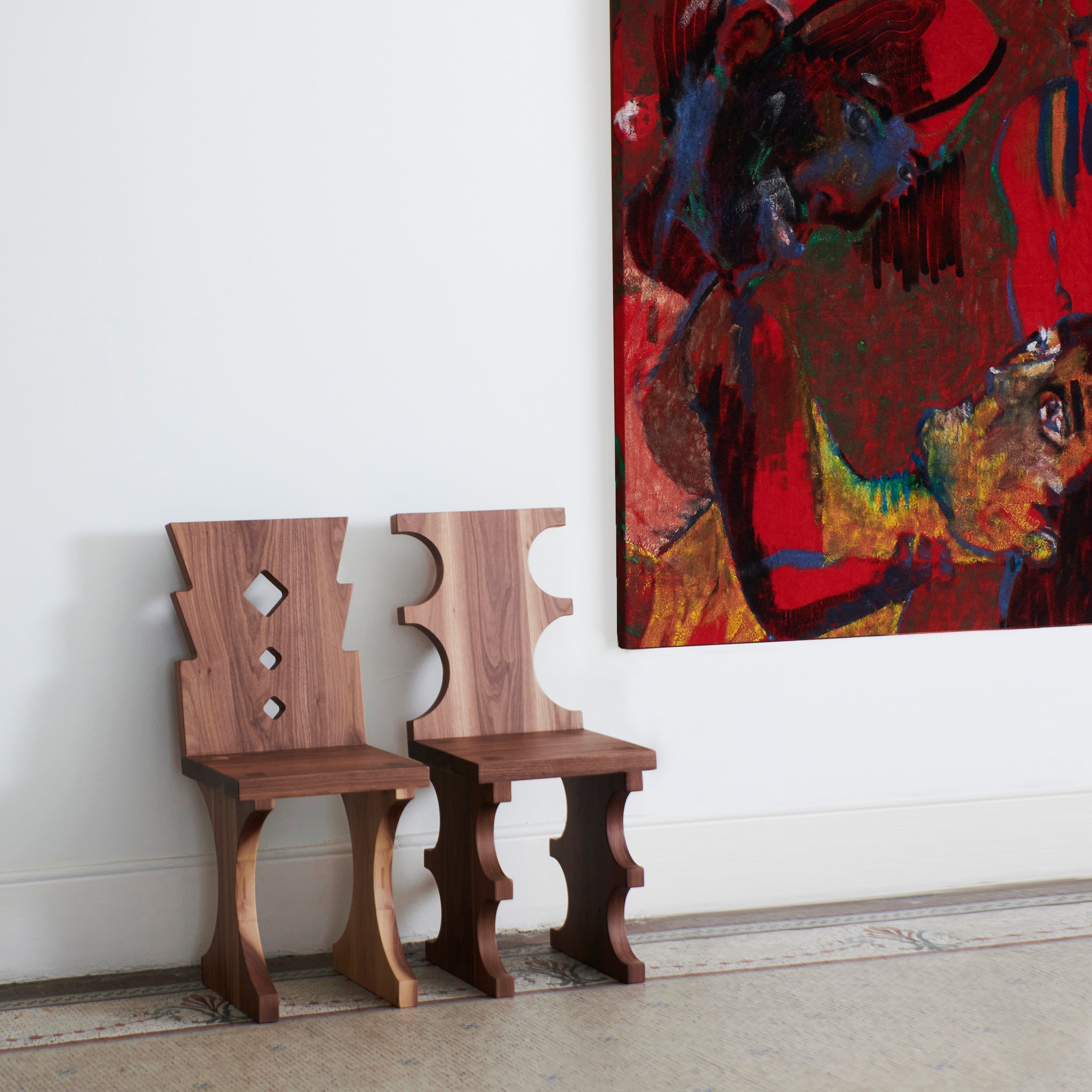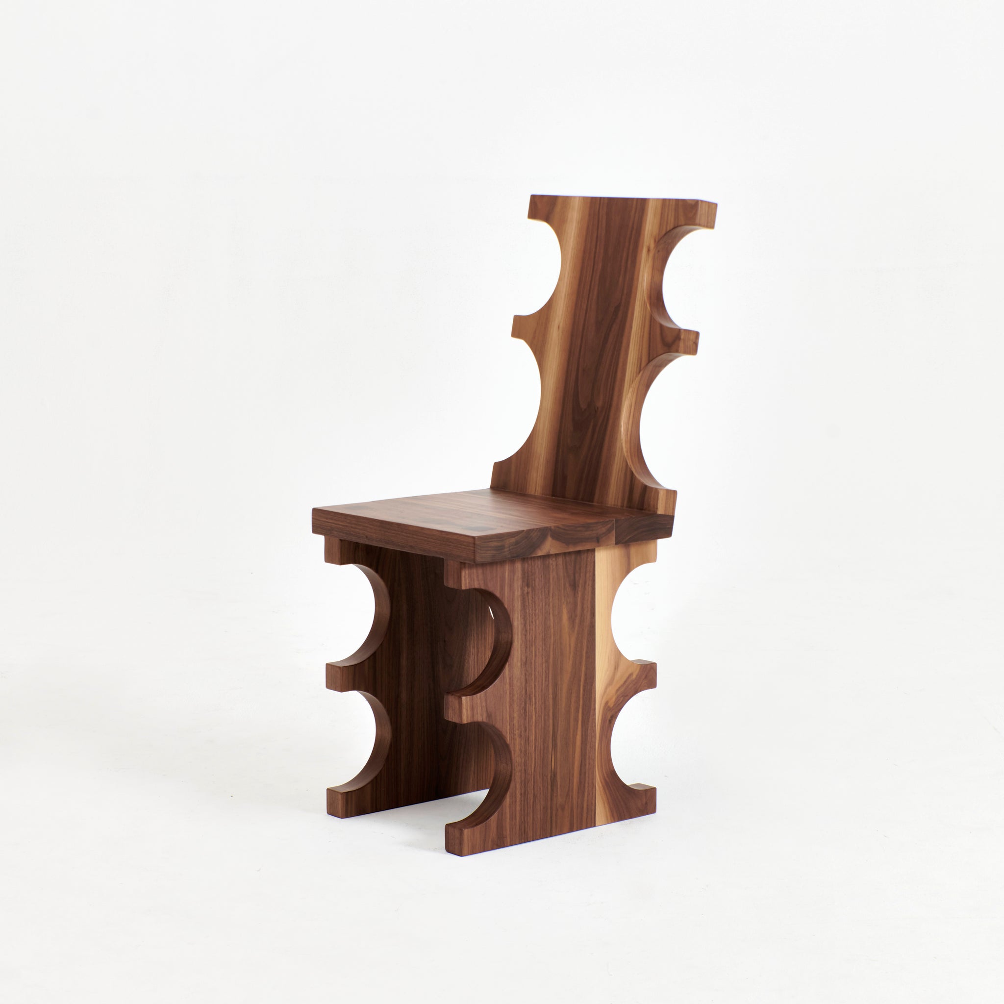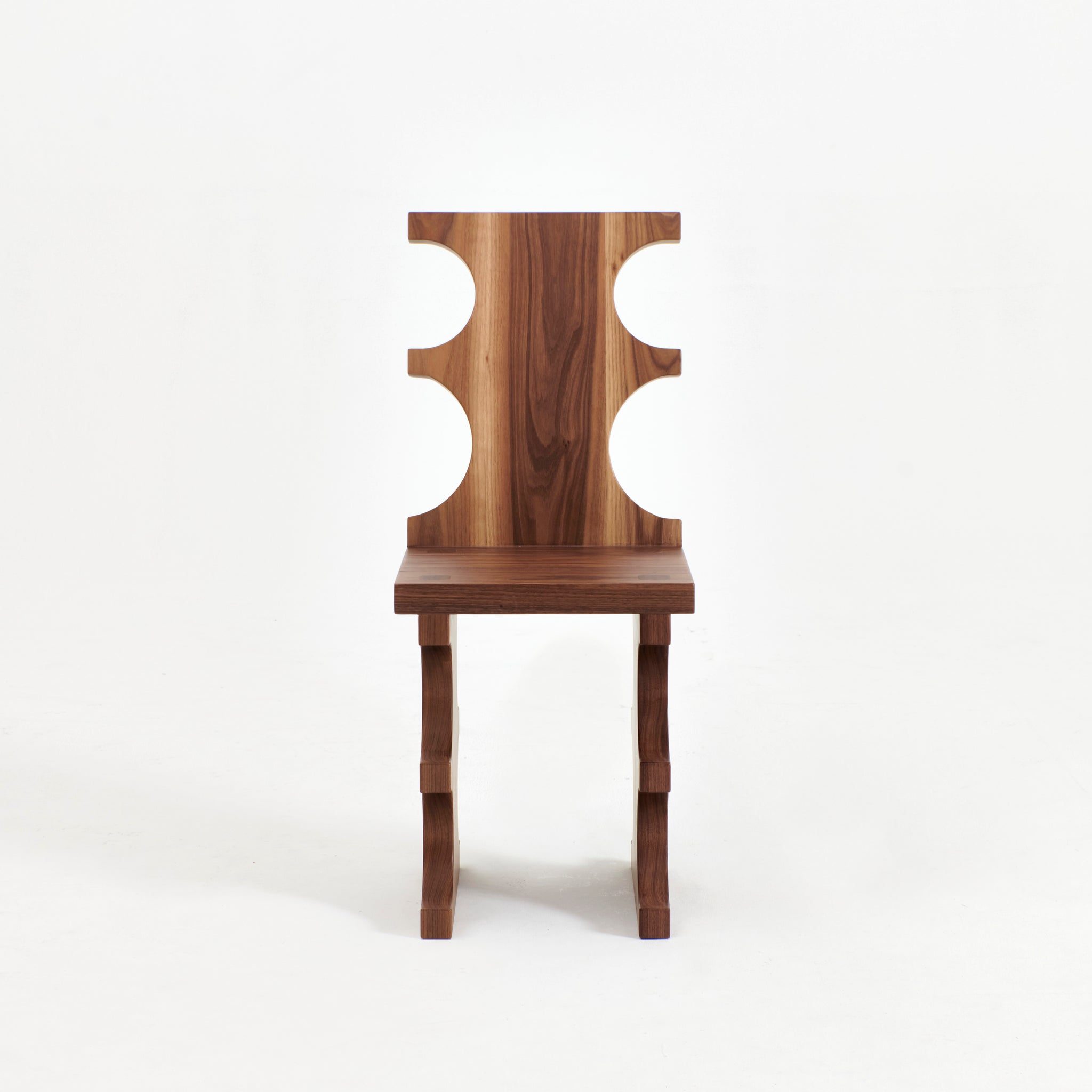 This chair is part of a series with eight different designs with a graphic shaped backrest and structural legs. Crafted from solid walnut by skilled artisans in Northern Portugal.