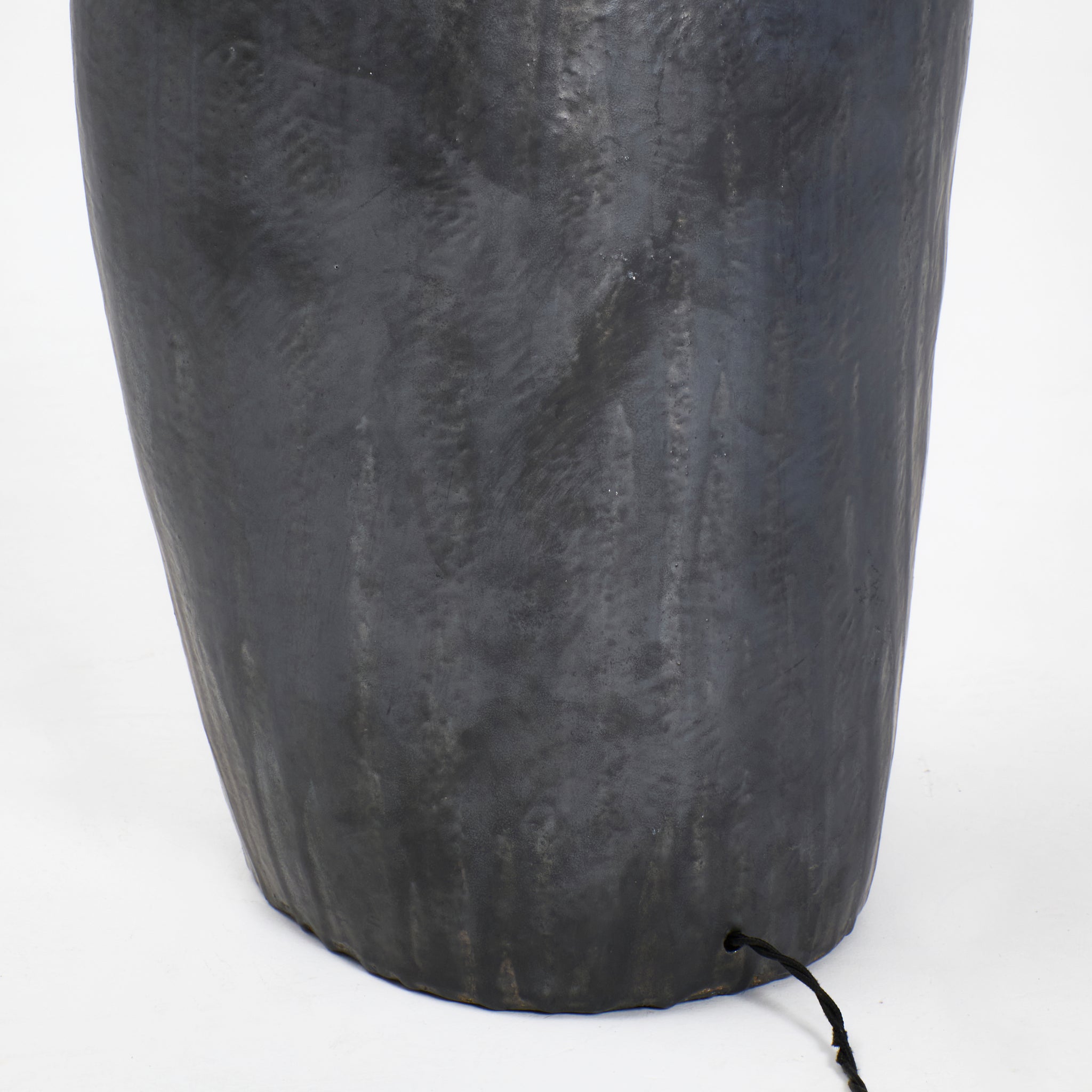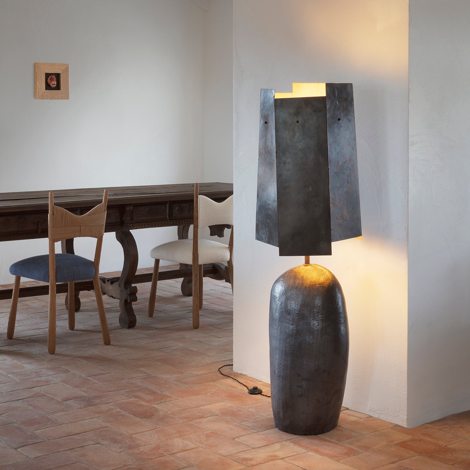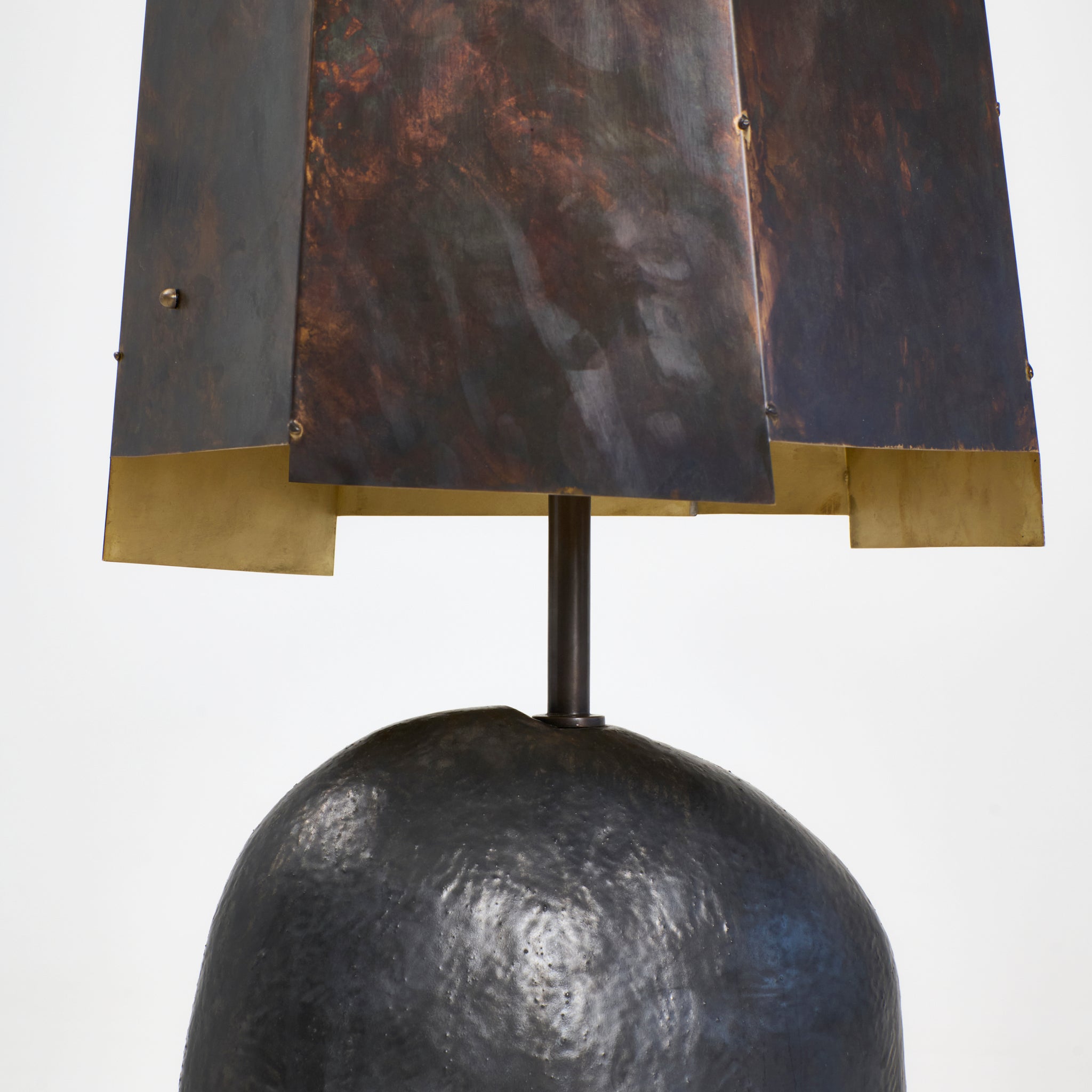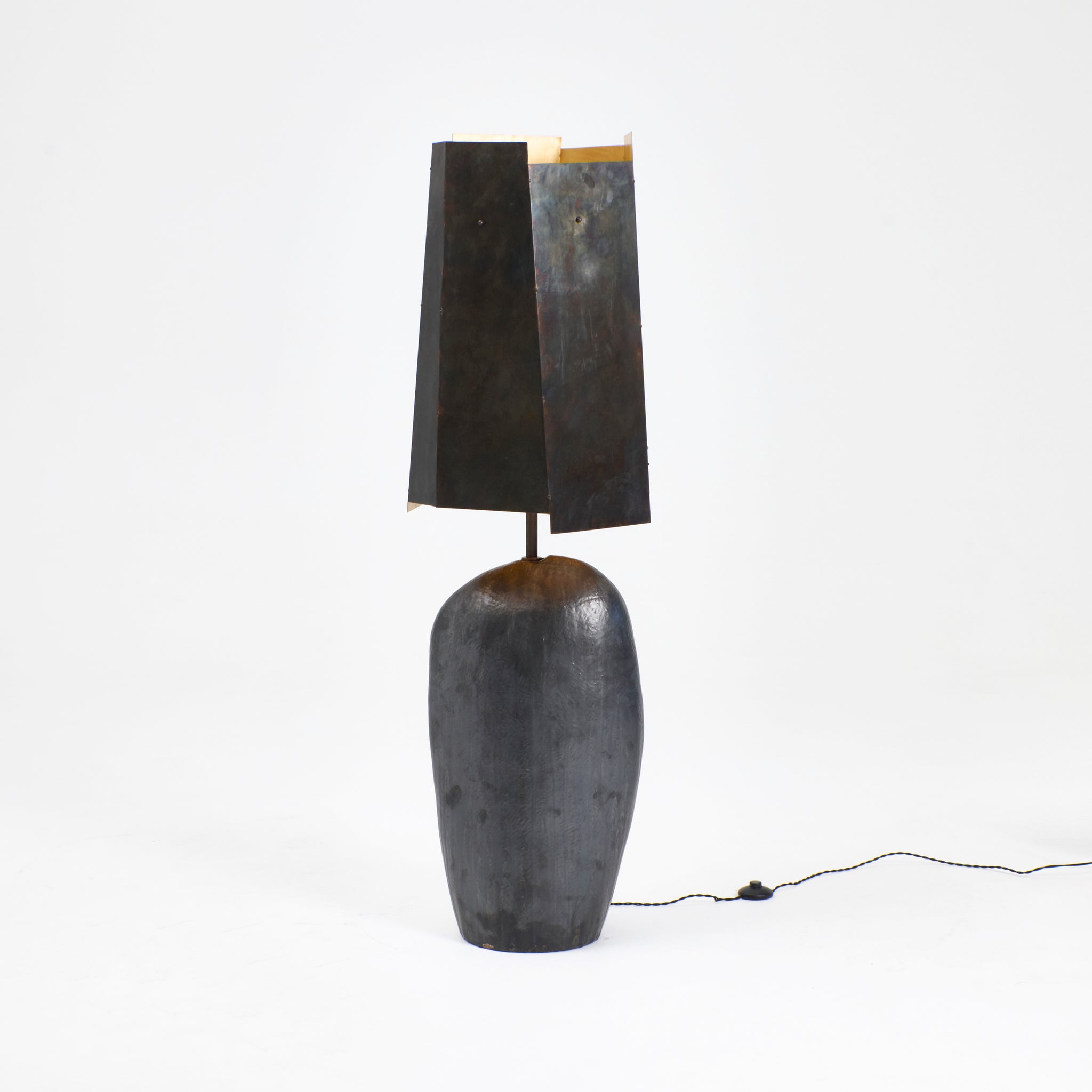 Large artisanal ceramic floor light with an organic shape and large geometric metal shade. The ceramic base is hand-sculpted in Project 213A's own ceramic workshop. Each piece is unique due to its handmade nature, shapes and shades vary slightly.